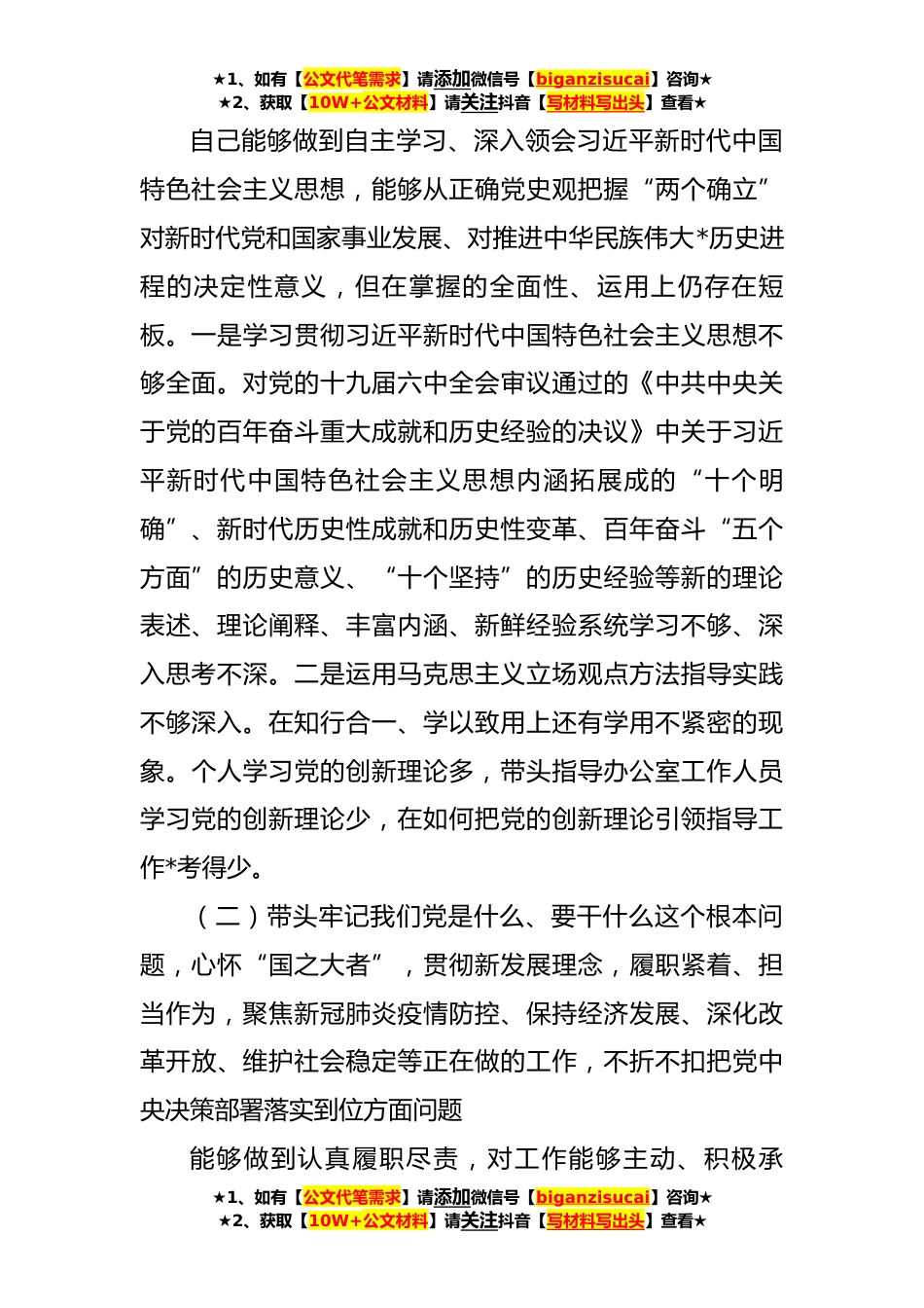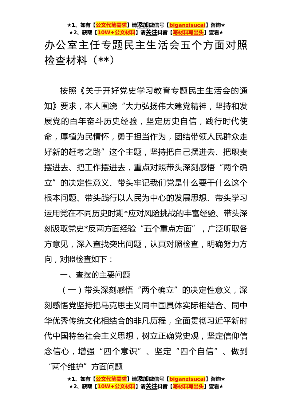 ★1、如有【公文代笔需求】请添加微信号【biganzisucai】咨询★★2、获取【10W+公文材料】请关注抖音【写材料写出头】查看★办公室主任专题民主生活会五个方面对照检查材料(**)按照《关于开好党史学习教育专题民主生活会的通知》要求,本人围绕“大力弘扬伟大建党精神,坚持和发展党的百年奋斗历史经验,坚定历史自信,践行时代使命,厚植为民情怀,勇于担当作为,团结带领人民群众走好新的赶考之路”这个主题,坚持把自己摆进去、把职责摆进去、把工作摆进去,重点对照带头深刻感悟“两个确立”的决定性意义、带头牢记我们党是什么要干什么这个根本问题、带头践行以人民为中心的发展思想、带头学习运用党在不同历史时期*应对风险挑战的丰富经验、带头深刻汲取党史*反两方面经验“五个重点方面”,广泛听取各方...