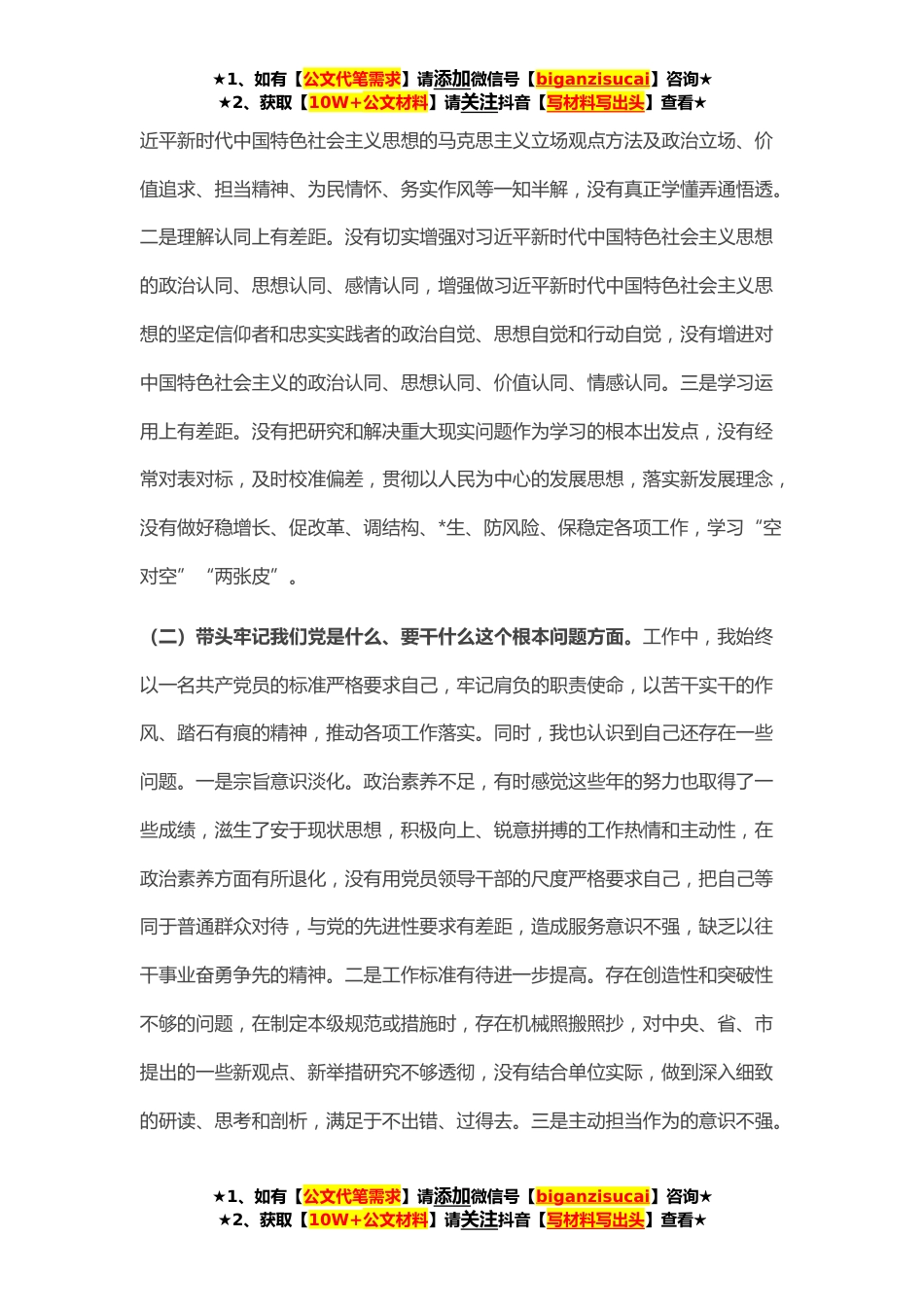★1、如有【公文代笔需求】请添加微信号【biganzisucai】咨询★★2、获取【10W+公文材料】请关注抖音【写材料写出头】查看★根据区委《关于开好党史学习教育专题民主生活会通知》要求,按照区委、区政府统一安排部署,对照“学党史、悟思想、办事、开新局”主题,围绕市委主要领导提出的要求,坚持把自己摆进去、把工作摆进去、把职责摆进去,通过学习反思、谈心谈话、征求意见,自我检视,围绕“五个带头”认真开展对照检查、剖析根源,并明确努力方向和改进措施。现将个人对照检查情况报告如下。一、体会认识党史学习教育开展以来,我严格按照“学党史、悟思想、办实事、开新局”的目标要求,带头制定个人自学计划,坚持读原著、学原文、悟原理,认真研读《中国共产党简史》《关于中国共产党历史论述摘编》《习...