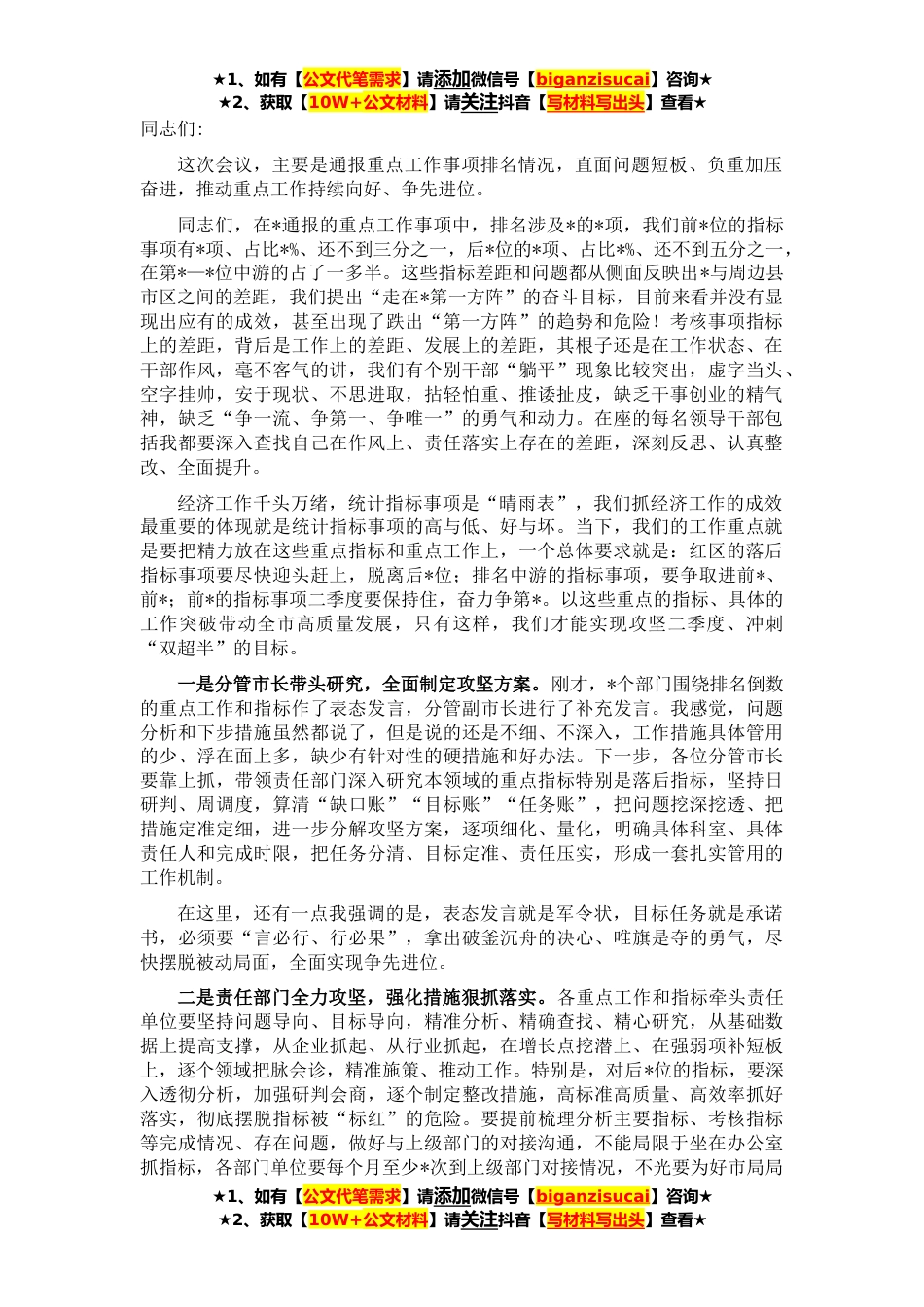 ★1、如有【公文代笔需求】请添加微信号【biganzisucai】咨询★★2、获取【10W+公文材料】请关注抖音【写材料写出头】查看★同志们:这次会议,主要是通报重点工作事项排名情况,直面问题短板、负重加压奋进,推动重点工作持续向好、争先进位。同志们,在*通报的重点工作事项中,排名涉及*的*项,我们前*位的指标事项有*项、占比*%、还不到三分之一,后*位的*项、占比*%、还不到五分之一,在第*—*位中游的占了一多半。这些指标差距和问题都从侧面反映出*与周边县市区之间的差距,我们提出“走在*第一方阵”的奋斗目标,目前来看并没有显现出应有的成效,甚至出现了跌出“第一方阵”的趋势和危险!考核事项指标上的差距,背后是工作上的差距、发展上的差距,其根子还是在工作状态、在干部作风,毫不客气的讲,我们...