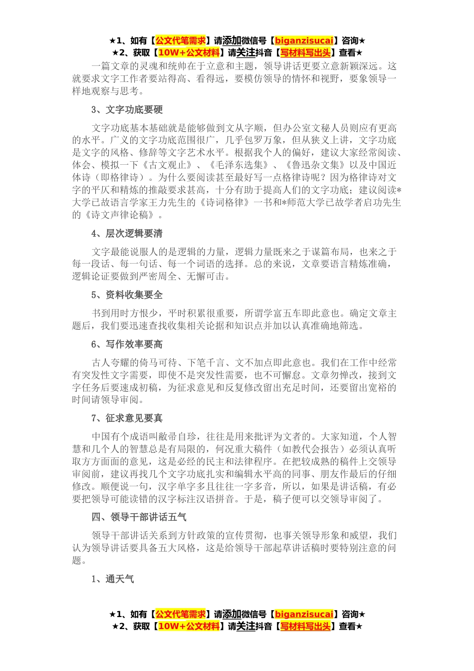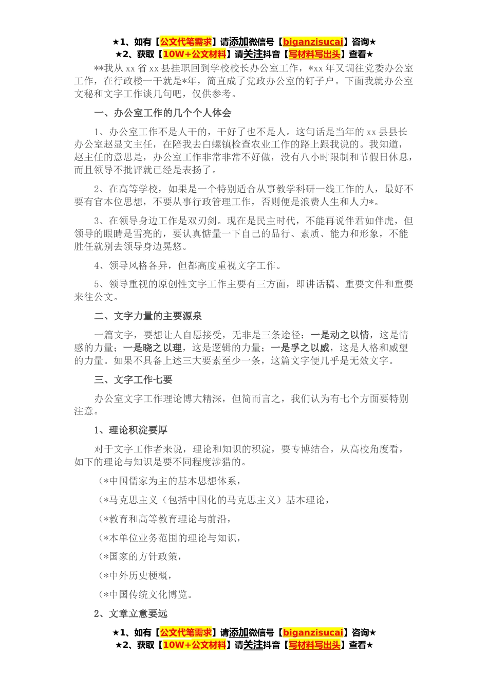 ★1、如有【公文代笔需求】请添加微信号【biganzisucai】咨询★★2、获取【10W+公文材料】请关注抖音【写材料写出头】查看★**我从xx省xx县挂职回到学校校长办公室工作,*xx年又调往党委办公室工作,在行政楼一干就是*年,简直成了党政办公室的钉子户。下面我就办公室文秘和文字工作谈几句吧,仅供参考。一、办公室工作的几个个人体会1、办公室工作不是人干的,干好了也不是人。这句话是当年的xx县县长办公室赵显文主任,在陪我去白螺镇检查农业工作的路上跟我说的。我知道,赵主任的意思是,办公室工作非常非常不好做,没有八小时限制和节假日休息,而且领导不批评就已经是表扬了。2、在高等学校,如果是一个特别适合从事教学科研一线工作的人,最好不要有官本位思想,不要从事行政管理工作,否则便是浪费人生和...