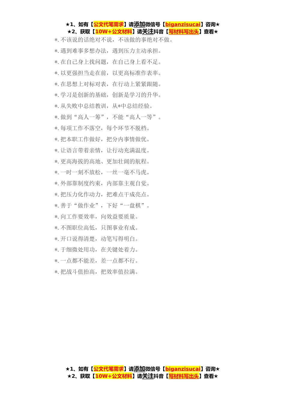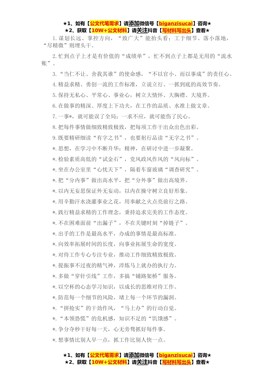 ★1、如有【公文代笔需求】请添加微信号【biganzisucai】咨询★★2、获取【10W+公文材料】请关注抖音【写材料写出头】查看★1.谋划长远、掌控方向,“致广大”能抬头看;工于细节、落小落地,“尽精微”则埋头干。2.忙到点子上才是有价值的“成绩单”,忙不到点子上都是无用的“流水账”。3.“当仁不让、舍我其谁”的使命感,“不以官小、而以事成”的责任心。4.精益求精、勇创一流的工作标准,立说立行、一抓到底的高效节奏。5.保持无私心、平常心、事业心,树立大情怀、大胸襟、大境界。6.在做事的精深、厚度上下功夫,在工作的品质、水准上做文章。7.一事*,就可能误了全局;一求不应,就可能伤了民心。8.把每件事情做细致精致极致,把每项工作干出众出色出彩。9.既要精研细读“有字之书”,也要躬行品读“无字...