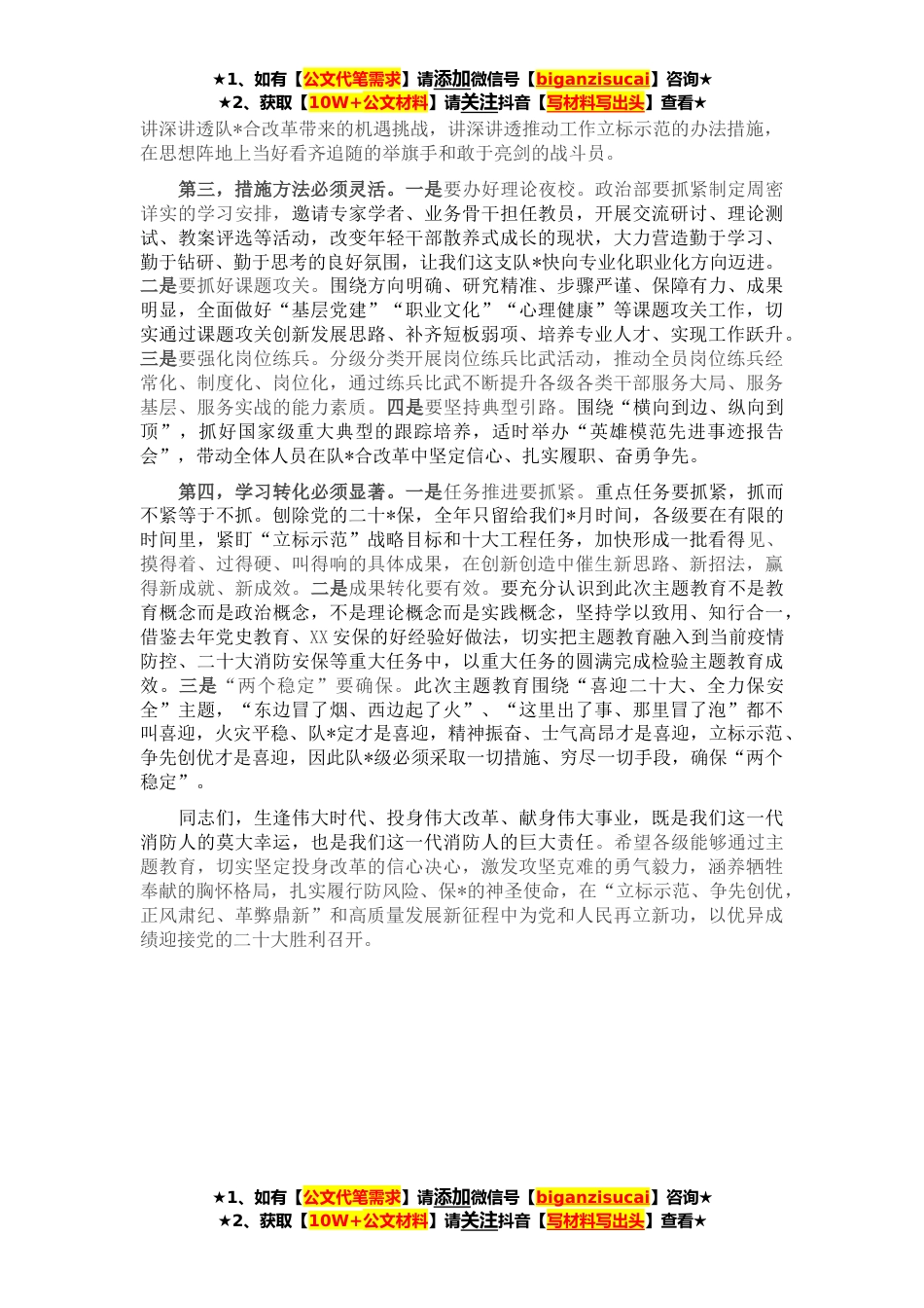 ★1、如有【公文代笔需求】请添加微信号【biganzisucai】咨询★★2、获取【10W+公文材料】请关注抖音【写材料写出头】查看★刚才,XX总队长带领大家学习了全国“两会”精神,特别是总书记的重要讲话,内容很丰富,意义很深刻,希望大家认真学习,抓好落实。今年的全国“两会”是在党的二十大前夕召开的重要会议,是党和国家政治生活中的一件大事,尤其是习近平总书记在参加*、*军代表团和农业界、社会福利和社会保障界委员联组会时,发表了一系列重要讲话,具有很强的政治性、思想性、针对性、指导性。队*级要将学习贯彻好全国“两会”精神作为重要政治任务,精心组织、周密部署,深入学习、全面领会,确保习近平总书记重要讲话和党中央决策部署在*消防救援队*地生根、开花结果,以实际行动迎接党的二十大胜利召开...