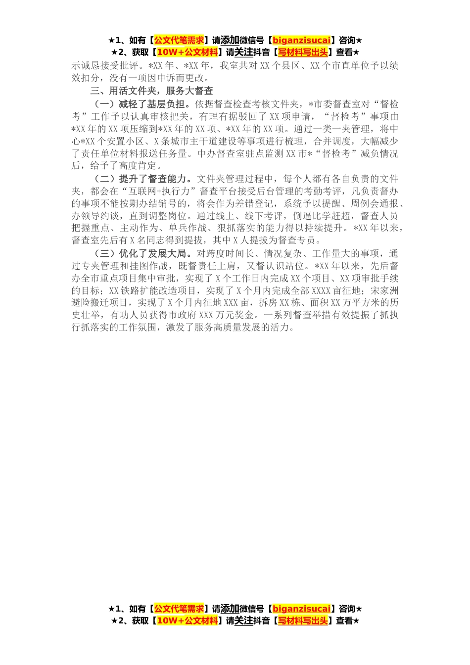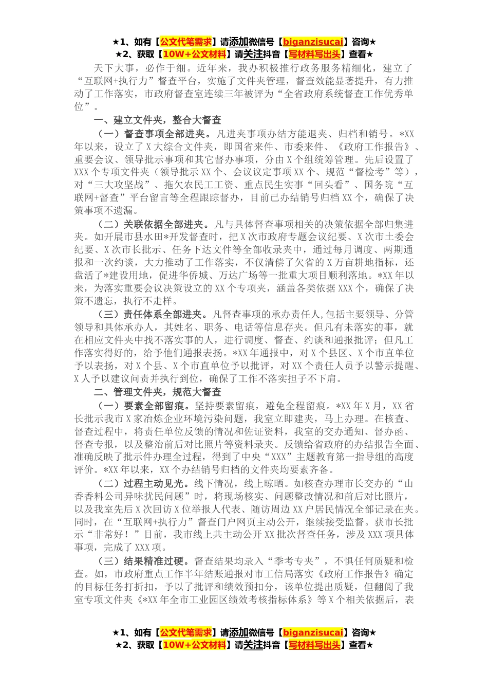 ★1、如有【公文代笔需求】请添加微信号【biganzisucai】咨询★★2、获取【10W+公文材料】请关注抖音【写材料写出头】查看★天下大事,必作于细。近年来,我办积极推行政务服务精细化,建立了“互联网+执行力”督查平台,实施了文件夹管理,督查效能显著提升,有力推动了工作落实,市政府督查室连续三年被评为“全省政府系统督查工作优秀单位”。一、建立文件夹,整合大督查(一)督查事项全部进夹。凡进夹事项办结方能退夹、归档和销号。*XX年以来,设立了X大综合文件夹,即国省来件、市委来件、《政府工作报告》、重要会议、领导批示事项和其它督办事项,分由X个组统筹管理。先后设置了XXX个专项文件夹(领导批示XX个、会议议定事项XX个、规范“督检考”等),对“三大攻坚战”、拖欠农民工工资、重点民生实事“...