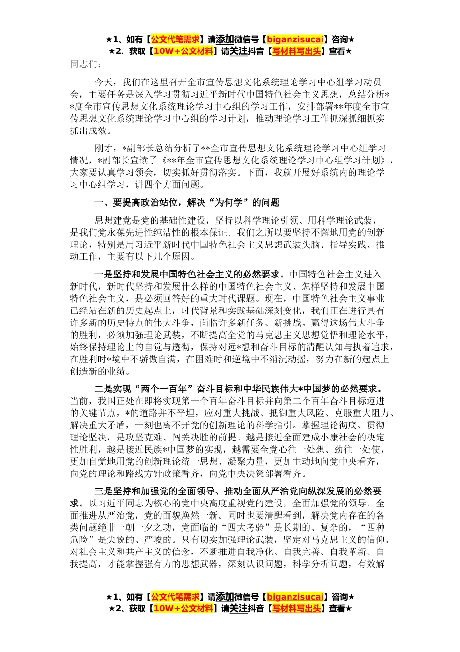 ★1、如有【公文代笔需求】请添加微信号【biganzisucai】咨询★★2、获取【10W+公文材料】请关注抖音【写材料写出头】查看★同志们:今天,我们在这里召开全市宣传思想文化系统理论学习中心组学习动员会,主要任务是深入学习贯彻习近平新时代中国特色社会主义思想,总结分析**度全市宣传思想文化系统理论学习中心组的学习工作,安排部署**年度全市宣传思想文化系统理论学习中心组的学习计划,推动理论学习工作抓深抓细抓实抓出成效。刚才,*副部长总结分析了**全市宣传思想文化系统理论学习中心组学习情况,*副部长宣读了《**年全市宣传思想文化系统理论学习中心组学习计划》,大家要认真学习领会,切实抓好贯彻落实。下面,我就开展好系统内的理论学习中心组学习,讲四个方面问题。一、要提高政治站位,解决“为...