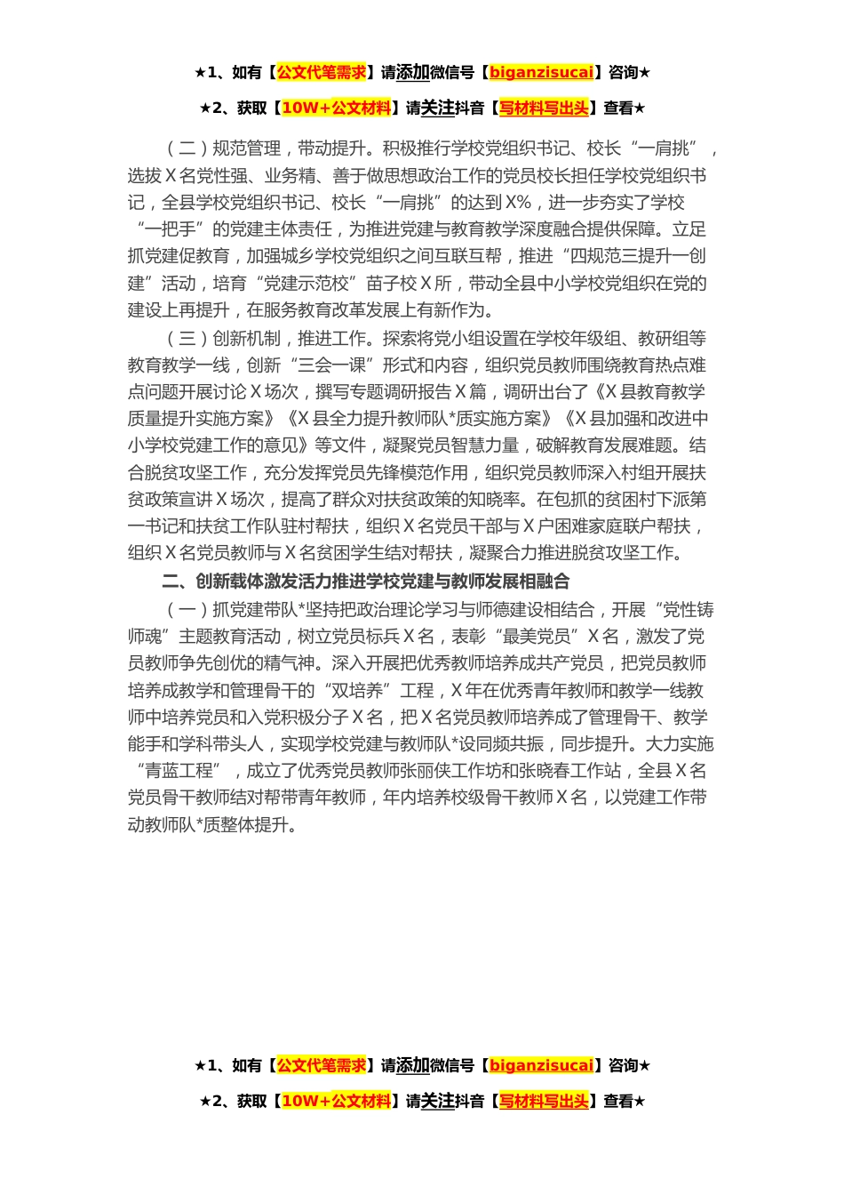 ★1、如有【公文代笔需求】请添加微信号【biganzisucai】咨询★★2、获取【10W+公文材料】请关注抖音【写材料写出头】查看★X县现有中小学校X所,公民办幼儿园X所,教职工X人,在校中小学生和在园幼儿X人。县教体局党委下属党总支部X个、党支部X个和党员X名。X年,该县认真贯彻落实中央和省市《关于加强中小学校党的建设工作的意见》精神,以“建强每个支部、打造过硬队伍、助力追赶超越”为目标,以“党建示范校”创建为抓手,深入推进学校党建与教育需求、教师发展和学生成长相融合,充分发挥学校党组织的政治核心功能和党员教师的先锋模范作用,为教育事业追赶超越提供了坚强的政治和组织保证。一、理顺体制规范管理推进学校党建与教育需求相融合(一)理顺体制,筑强堡垒。按照中组部和教育部党组《关于加强中...