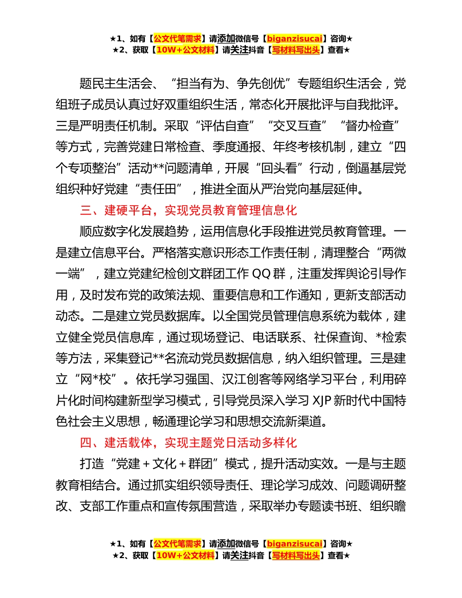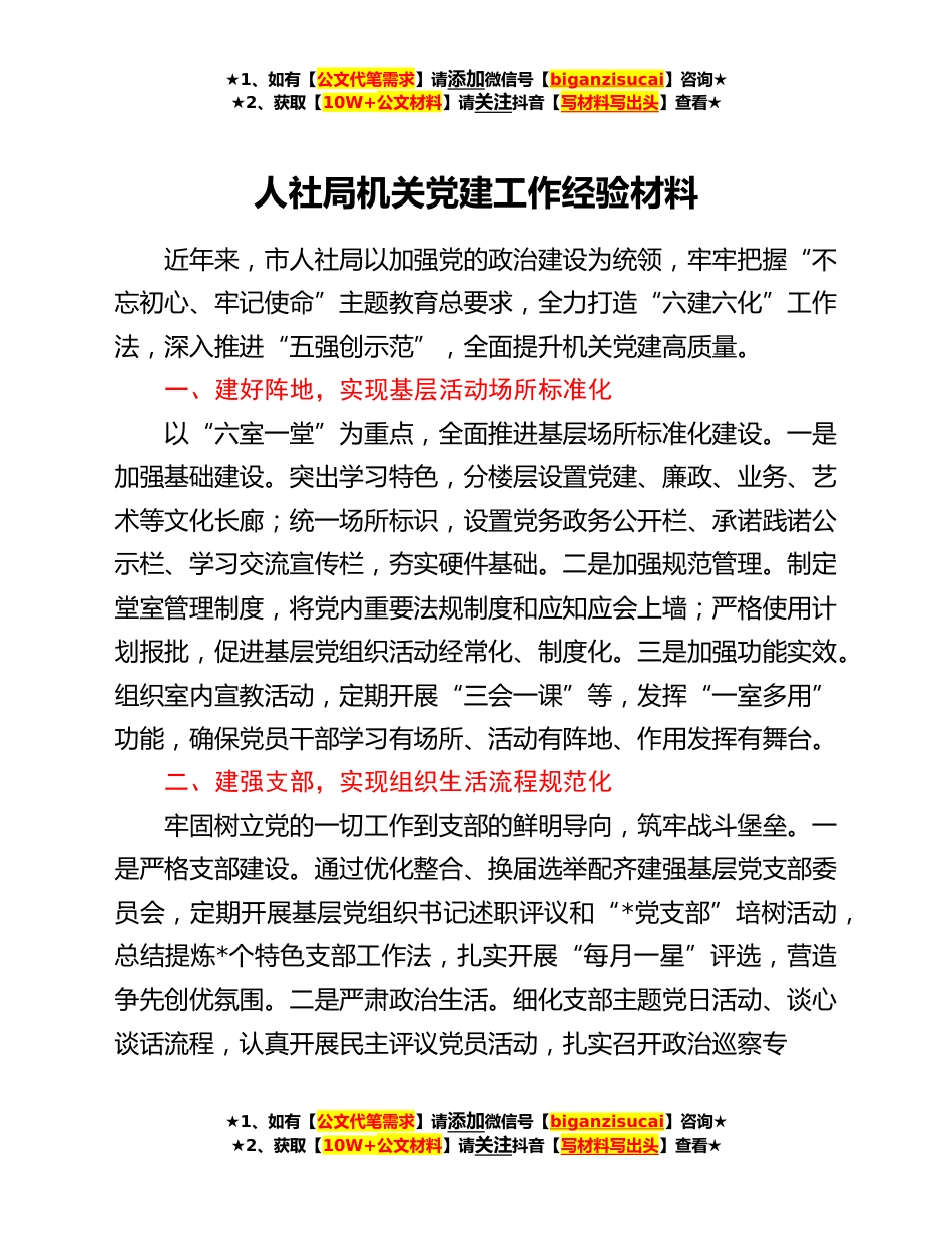 ★1、如有【公文代笔需求】请添加微信号【biganzisucai】咨询★★2、获取【10W+公文材料】请关注抖音【写材料写出头】查看★人社局机关党建工作经验材料近年来,市人社局以加强党的政治建设为统领,牢牢把握“不忘初心、牢记使命”主题教育总要求,全力打造“六建六化”工作法,深入推进“五强创示范”,全面提升机关党建高质量。一、建好阵地,实现基层活动场所标准化以“六室一堂”为重点,全面推进基层场所标准化建设。一是加强基础建设。突出学习特色,分楼层设置党建、廉政、业务、艺术等文化长廊;统一场所标识,设置党务政务公开栏、承诺践诺公示栏、学习交流宣传栏,夯实硬件基础。二是加强规范管理。制定堂室管理制度,将党内重要法规制度和应知应会上墙;严格使用计划报批,促进基层党组织活动经常化、...