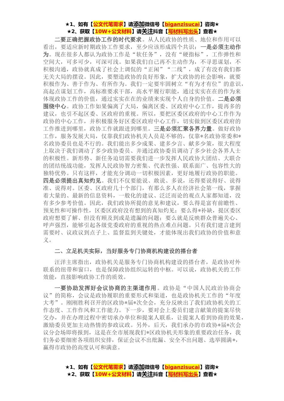 ★1、如有【公文代笔需求】请添加微信号【biganzisucai】咨询★★2、获取【10W+公文材料】请关注抖音【写材料写出头】查看★同志们:今天,是我们*区*届政协召开的第一次机关全体干部职工会议,目的是动员机关全体干部聚拢心神,以更加饱满的精神状态和严肃紧张活泼的工作态度,在新的起点上开创政协工作新局面。前不久,区政协*会议在*的带领和大家的共同努力下开得圆满*,新时代*政协事业发展的接力棒交到我们手上,我们有责任把历届政协的好传统、好作风、好经验继承好、坚持好、发扬好,不负韶华、不辱使命。前两天,我翻阅了一些关于我们政协的指导性文件,并与咱们机关各个委主任进行了逐一谈心交流,通过初步学习、初步了解,结合区委区政府对政协工作的要求,我对政协如何在全区工作大局中找准位置,对今...
