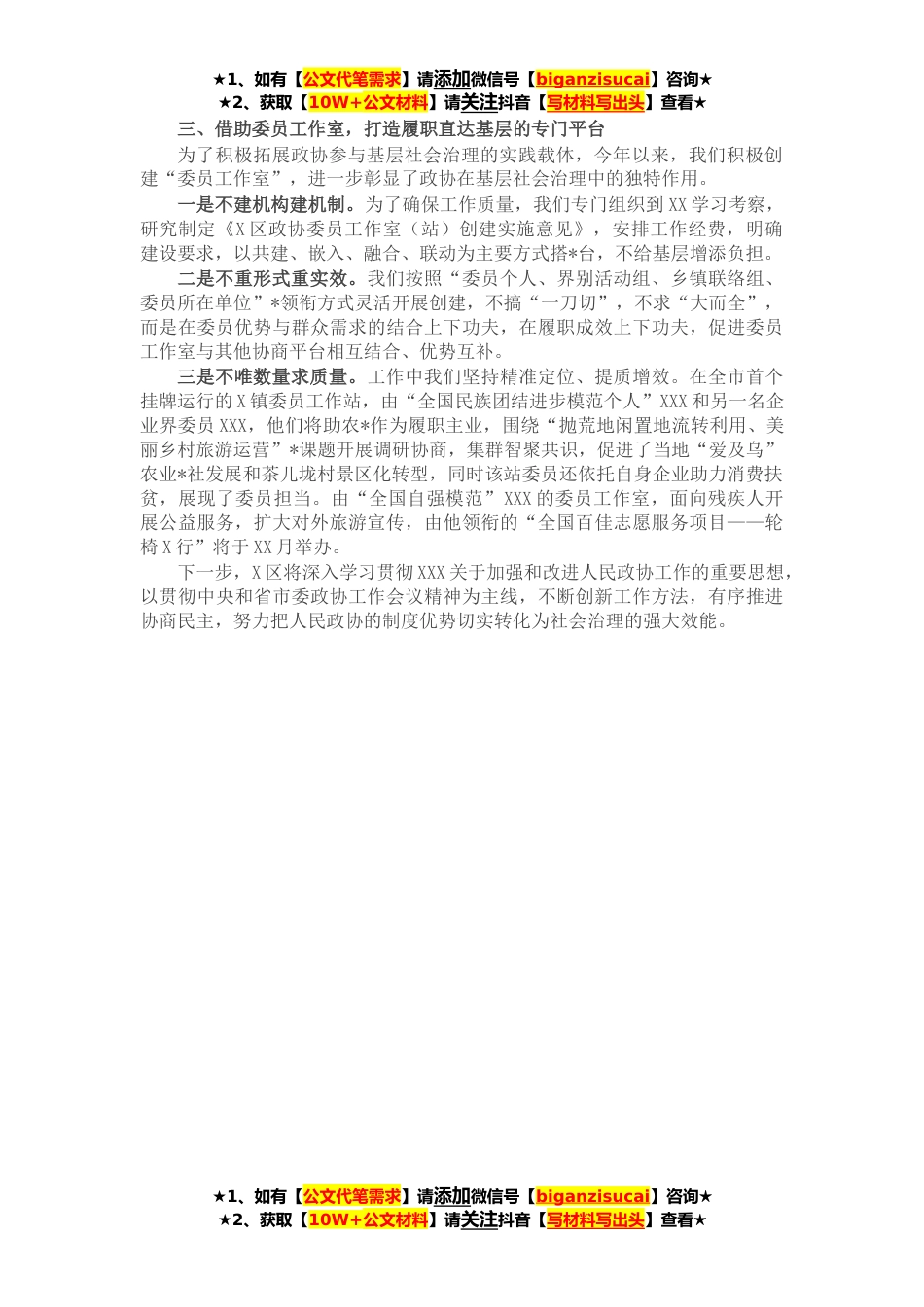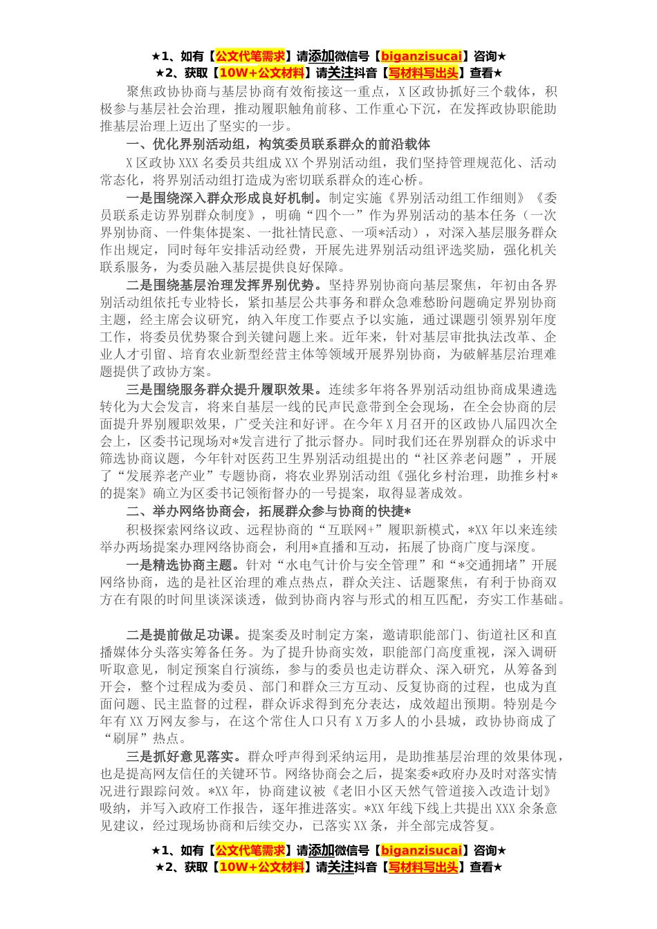 ★1、如有【公文代笔需求】请添加微信号【biganzisucai】咨询★★2、获取【10W+公文材料】请关注抖音【写材料写出头】查看★聚焦政协协商与基层协商有效衔接这一重点,X区政协抓好三个载体,积极参与基层社会治理,推动履职触角前移、工作重心下沉,在发挥政协职能助推基层治理上迈出了坚实的一步。一、优化界别活动组,构筑委员联系群众的前沿载体X区政协XXX名委员共组成XX个界别活动组,我们坚持管理规范化、活动常态化,将界别活动组打造成为密切联系群众的连心桥。一是围绕深入群众形成良好机制。制定实施《界别活动组工作细则》《委员联系走访界别群众制度》,明确“四个一”作为界别活动的基本任务(一次界别协商、一件集体提案、一批社情民意、一项*活动),对深入基层服务群众作出规定,同时每年安排活动...