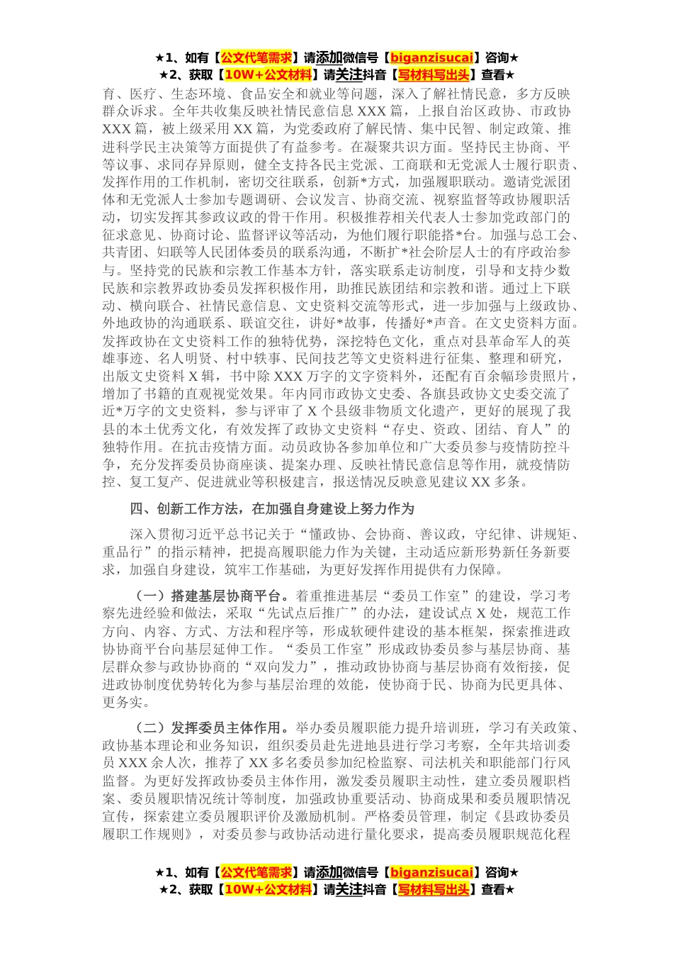 ★1、如有【公文代笔需求】请添加微信号【biganzisucai】咨询★★2、获取【10W+公文材料】请关注抖音【写材料写出头】查看★**,县政协在县委的坚强领导下,以习近平新时代中国特色社会主义思想为指导,牢牢把握团结和民主两大主题,团结和带领政协各委室、机关全体干部和全体政协委员,全面履行政协职能,较好地完成了全年各项工作任务,现将一年来工作开展情况汇报如下。一、坚持党的领导,把握正确政治方向。县政协坚持把党的领导放在首要位置,充分发挥政协党组在工作中的带头作用,教育引导机关干部职工和广大政协委员坚定执行党的政治路线,严格遵守政治纪律*治规矩,树牢“四个意识”,坚定“四个自信”,做到“两个维护”。县政协坚持、依靠和自觉接受县委领导,及时请示重大事项、报告重点工作、反映重要...