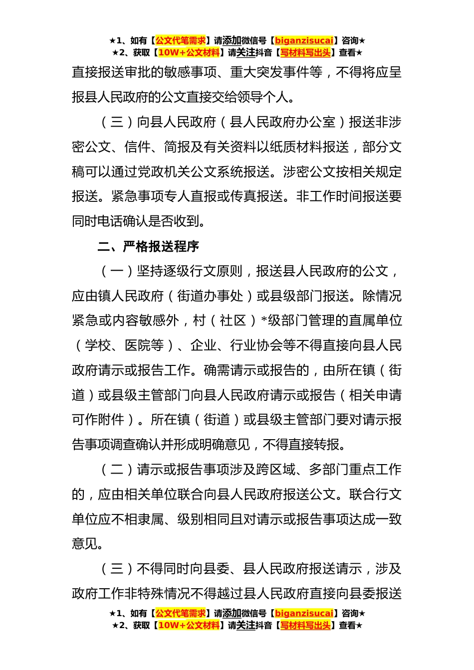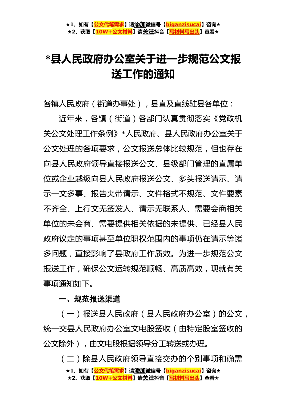 ★1、如有【公文代笔需求】请添加微信号【biganzisucai】咨询★★2、获取【10W+公文材料】请关注抖音【写材料写出头】查看★*县人民政府办公室关于进一步规范公文报送工作的通知各镇人民政府(街道办事处),县直及直线驻县各单位:近年来,各镇(街道)各部门认真贯彻落实《党政机关公文处理工作条例》*人民政府、县人民政府办公室关于公文处理的各项要求,公文报送总体比较规范,但也存在向县人民政府领导直接报送公文、县级部门管理的直属单位或企业越级向县人民政府报送公文、多头报送请示、请示一文多事、报告夹带请示、文件格式不规范、文件要素不齐全、上行文无签发人、请示无联系人、需要会商相关单位的未会商、需要提供相关依据的未提供、已经县人民政府议定的事项甚至单位职权范围内的事项仍在请示等诸...