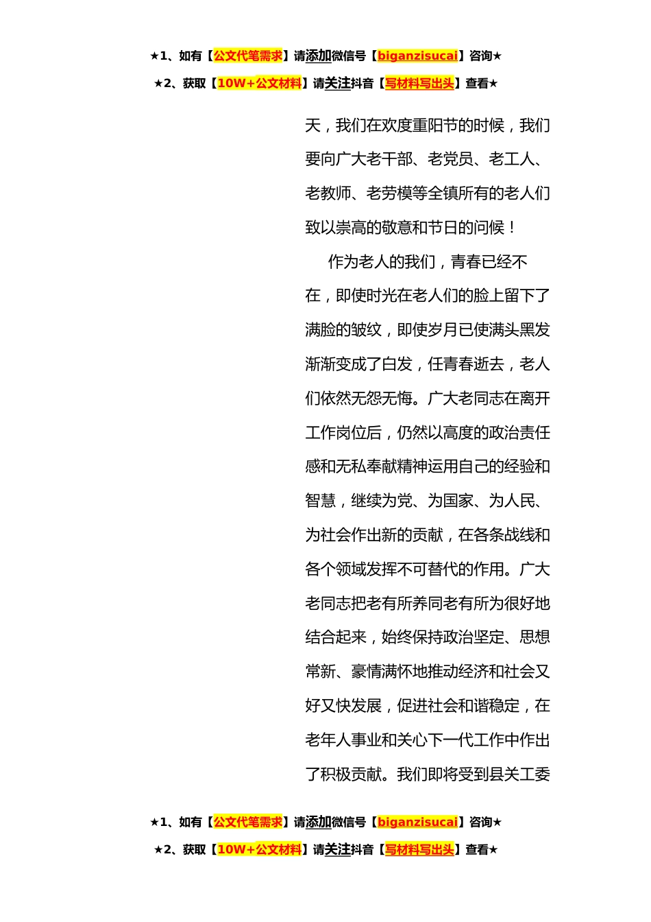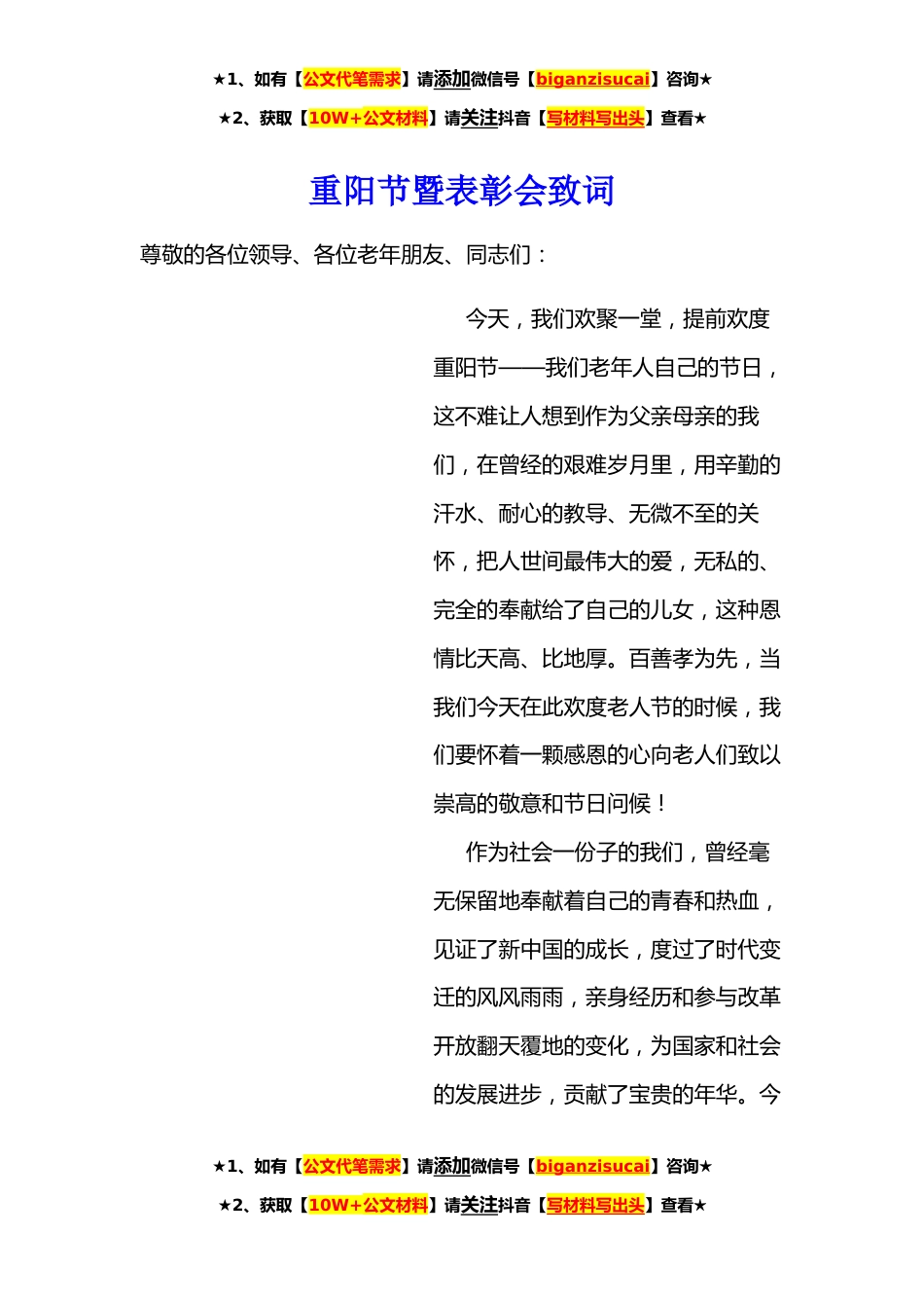 ★1、如有【公文代笔需求】请添加微信号【biganzisucai】咨询★★2、获取【10W+公文材料】请关注抖音【写材料写出头】查看★重阳节暨表彰会致词尊敬的各位领导、各位老年朋友、同志们:今天,我们欢聚一堂,提前欢度重阳节——我们老年人自己的节日,这不难让人想到作为父亲母亲的我们,在曾经的艰难岁月里,用辛勤的汗水、耐心的教导、无微不至的关怀,把人世间最伟大的爱,无私的、完全的奉献给了自己的儿女,这种恩情比天高、比地厚。百善孝为先,当我们今天在此欢度老人节的时候,我们要怀着一颗感恩的心向老人们致以崇高的敬意和节日问候!作为社会一份子的我们,曾经毫无保留地奉献着自己的青春和热血,见证了新中国的成长,度过了时代变迁的风风雨雨,亲身经历和参与改革开放翻天覆地的变化,为国家和社会...