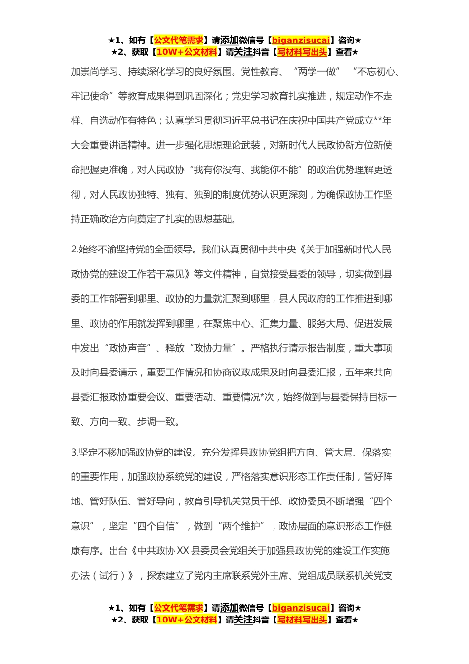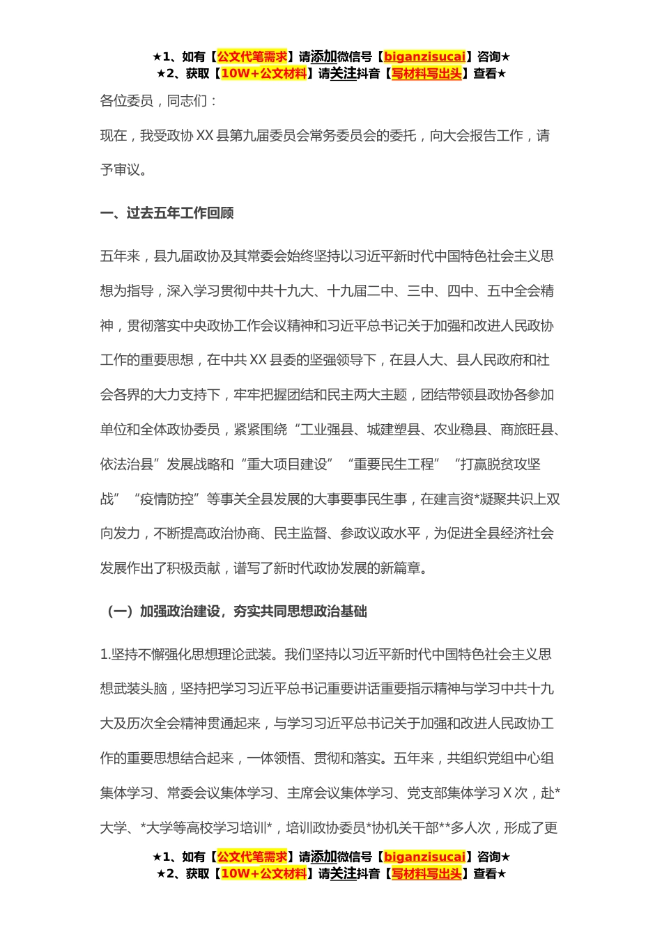 ★1、如有【公文代笔需求】请添加微信号【biganzisucai】咨询★★2、获取【10W+公文材料】请关注抖音【写材料写出头】查看★各位委员,同志们:现在,我受政协XX县第九届委员会常务委员会的委托,向大会报告工作,请予审议。一、过去五年工作回顾五年来,县九届政协及其常委会始终坚持以习近平新时代中国特色社会主义思想为指导,深入学习贯彻中共十九大、十九届二中、三中、四中、五中全会精神,贯彻落实中央政协工作会议精神和习近平总书记关于加强和改进人民政协工作的重要思想,在中共XX县委的坚强领导下,在县人大、县人民政府和社会各界的大力支持下,牢牢把握团结和民主两大主题,团结带领县政协各参加单位和全体政协委员,紧紧围绕“工业强县、城建塑县、农业稳县、商旅旺县、依法治县”发展战略和“重大...