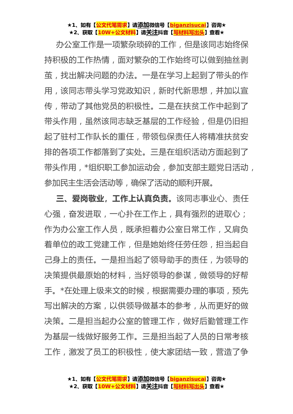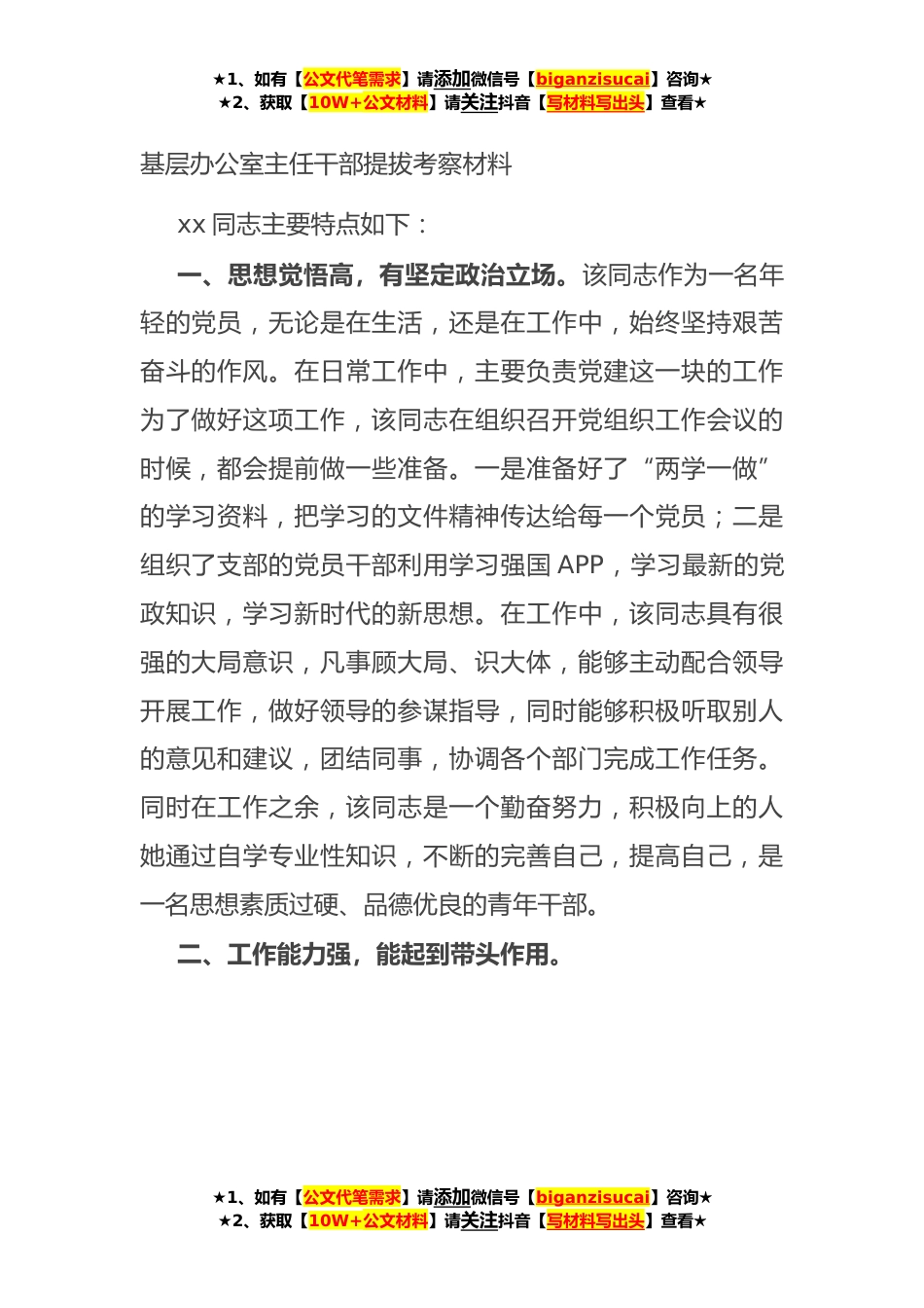★1、如有【公文代笔需求】请添加微信号【biganzisucai】咨询★★2、获取【10W+公文材料】请关注抖音【写材料写出头】查看★基层办公室主任干部提拔考察材料xx同志主要特点如下:一、思想觉悟高,有坚定政治立场。该同志作为一名年轻的党员,无论是在生活,还是在工作中,始终坚持艰苦奋斗的作风。在日常工作中,主要负责党建这一块的工作为了做好这项工作,该同志在组织召开党组织工作会议的时候,都会提前做一些准备。一是准备好了“两学一做”的学习资料,把学习的文件精神传达给每一个党员;二是组织了支部的党员干部利用学习强国APP,学习最新的党政知识,学习新时代的新思想。在工作中,该同志具有很强的大局意识,凡事顾大局、识大体,能够主动配合领导开展工作,做好领导的参谋指导,同时能够积极听取别人...
