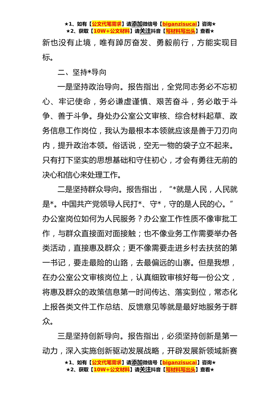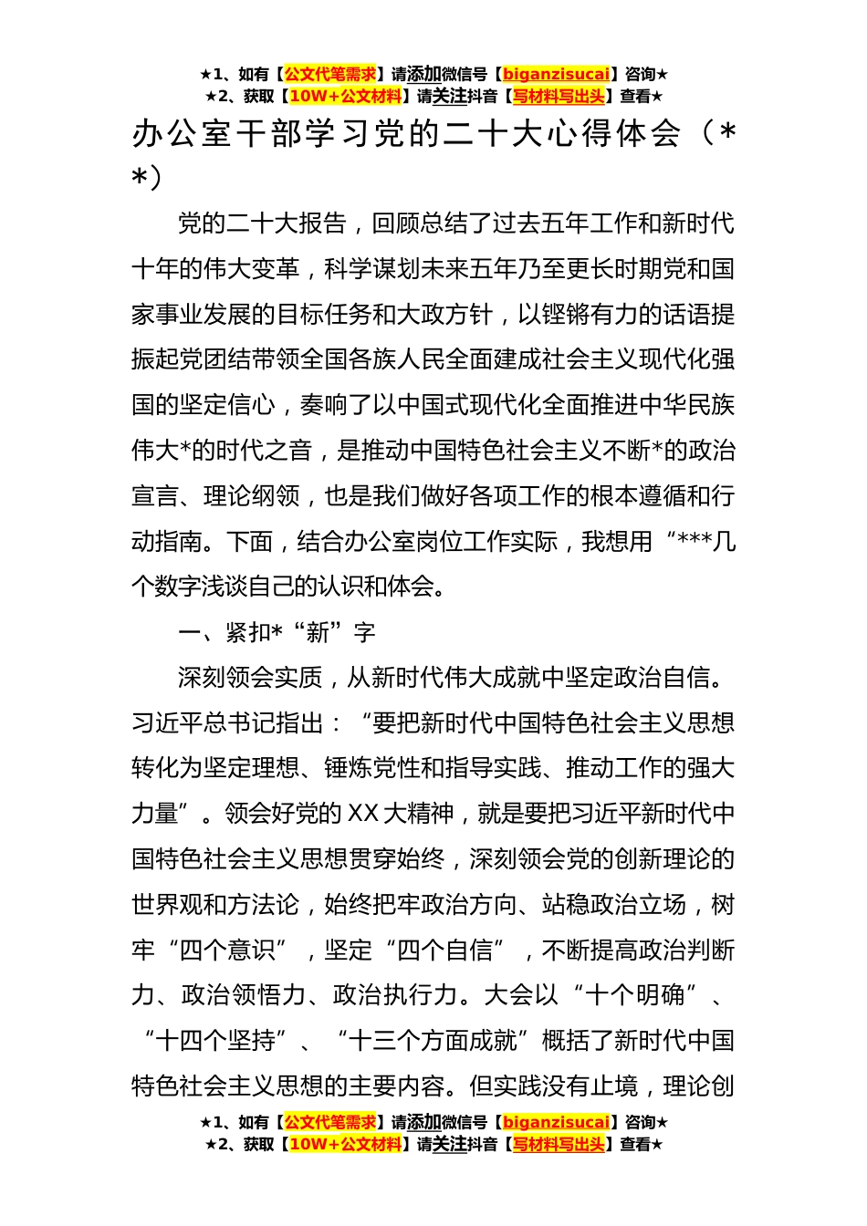 ★1、如有【公文代笔需求】请添加微信号【biganzisucai】咨询★★2、获取【10W+公文材料】请关注抖音【写材料写出头】查看★办公室干部学习党的二十大心得体会(**)党的二十大报告,回顾总结了过去五年工作和新时代十年的伟大变革,科学谋划未来五年乃至更长时期党和国家事业发展的目标任务和大政方针,以铿锵有力的话语提振起党团结带领全国各族人民全面建成社会主义现代化强国的坚定信心,奏响了以中国式现代化全面推进中华民族伟大*的时代之音,是推动中国特色社会主义不断*的政治宣言、理论纲领,也是我们做好各项工作的根本遵循和行动指南。下面,结合办公室岗位工作实际,我想用“***几个数字浅谈自己的认识和体会。一、紧扣*“新”字深刻领会实质,从新时代伟大成就中坚定政治自信。习近平总书记指出:“...