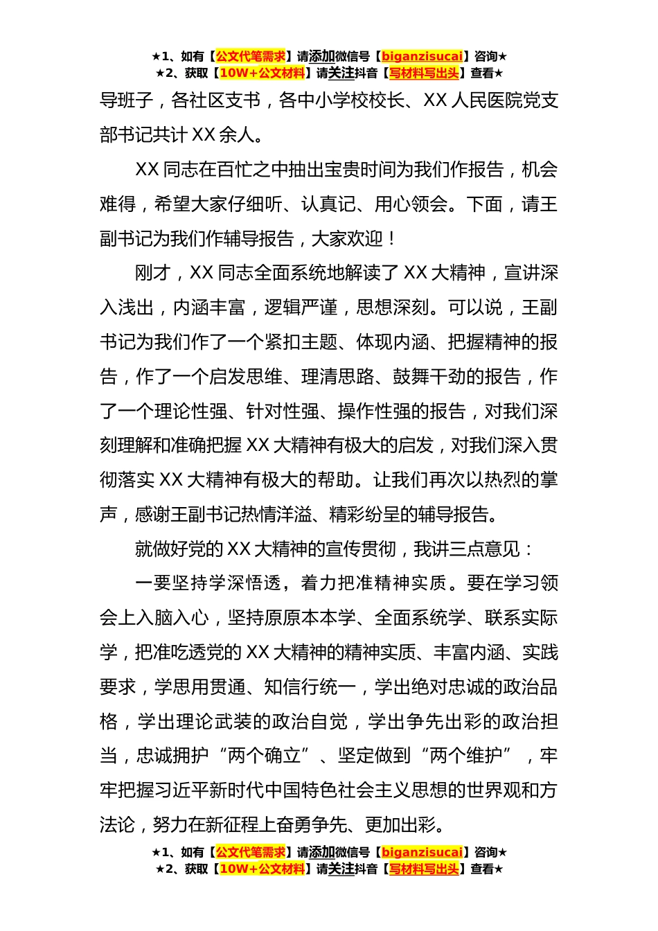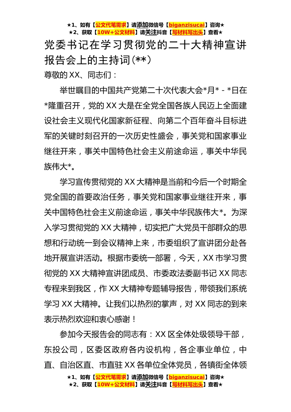 ★1、如有【公文代笔需求】请添加微信号【biganzisucai】咨询★★2、获取【10W+公文材料】请关注抖音【写材料写出头】查看★党委书记在学习贯彻党的二十大精神宣讲报告会上的主持词(**)尊敬的XX、同志们:举世瞩目的中国共产党第二十次代表大会*月*-*日在*隆重召开,党的XX大是在全党全国各族人民迈上全面建设社会主义现代化国家新征程、向第二个百年奋斗目标进军的关键时刻召开的一次历史性盛会,事关党和国家事业继往开来,事关中国特色社会主义前途命运,事关中华民族伟大*。学习宣传贯彻党的XX大精神是当前和今后一个时期全党全国的首要政治任务,事关党和国家事业继往开来,事关中国特色社会主义前途命运,事关中华民族伟大*。为深入学习贯彻党的XX大精神,切实把广大党员干部群众的思想和行动统一到会议精...