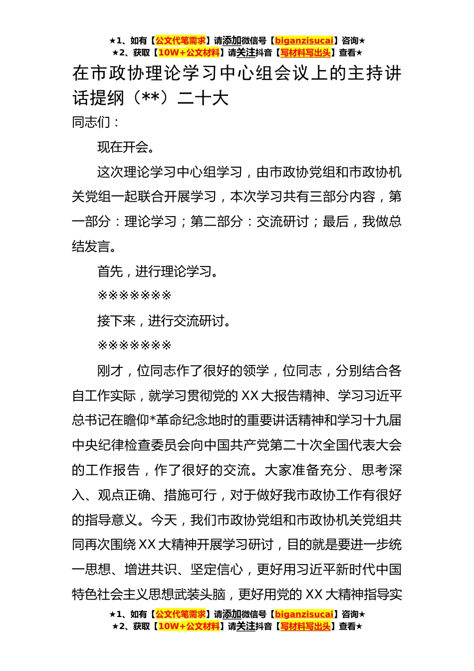 ★1、如有【公文代笔需求】请添加微信号【biganzisucai】咨询★★2、获取【10W+公文材料】请关注抖音【写材料写出头】查看★在市政协理论学习中心组会议上的主持讲话提纲(**)二十大同志们:现在开会。这次理论学习中心组学习,由市政协党组和市政协机关党组一起联合开展学习,本次学习共有三部分内容,第一部分:理论学习;第二部分:交流研讨;最后,我做总结发言。首先,进行理论学习。※※※※※※※接下来,进行交流研讨。※※※※※※※刚才,位同志作了很好的领学,位同志,分别结合各自工作实际,就学习贯彻党的XX大报告精神、学习习近平总书记在瞻仰*革命纪念地时的重要讲话精神和学习十九届中央纪律检查委员会向中国共产党第二十次全国代表大会的工作报告,作了很好的交流。大家准备充分、思考深入、观...