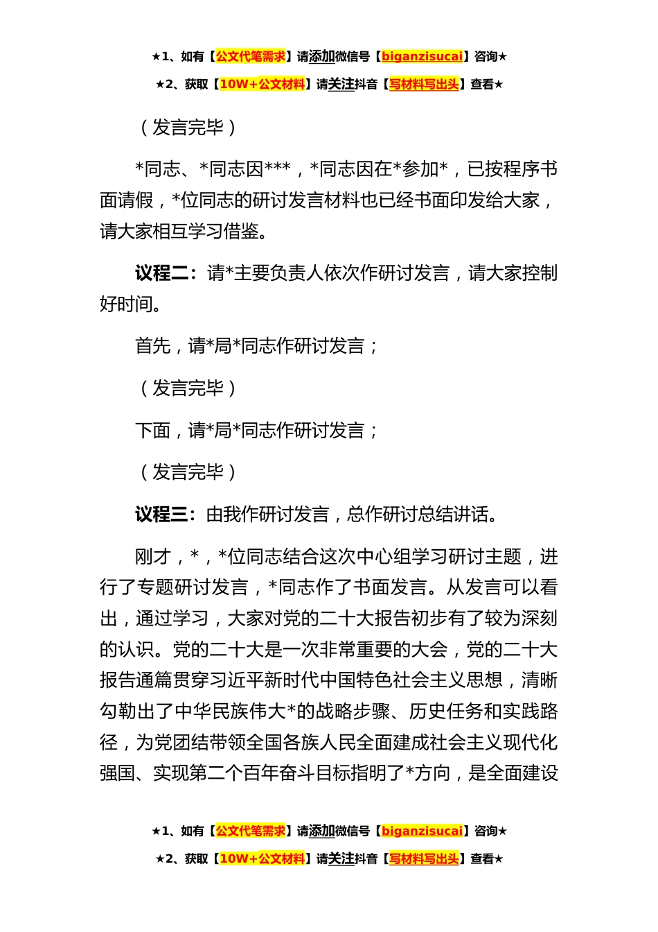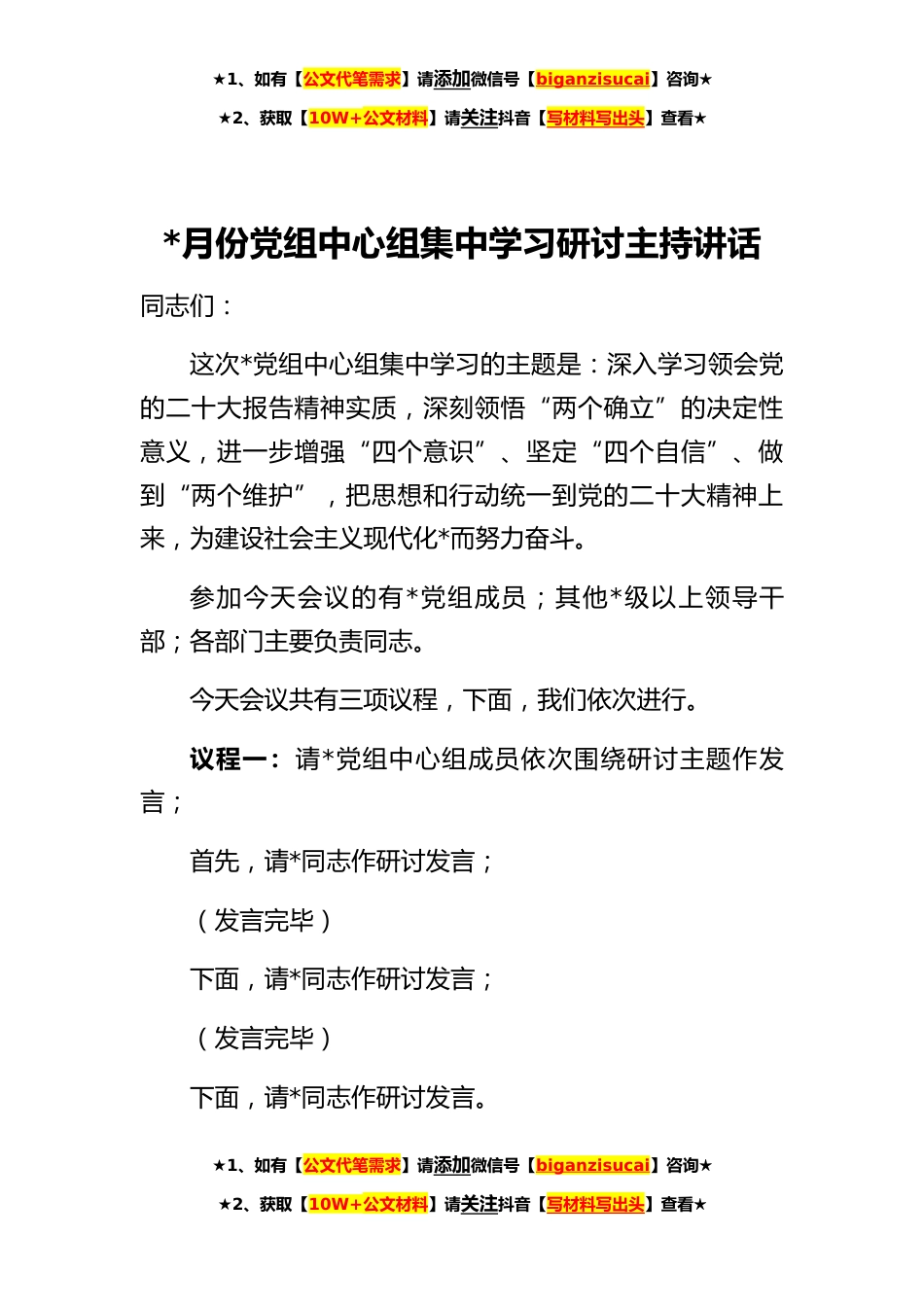 ★1、如有【公文代笔需求】请添加微信号【biganzisucai】咨询★★2、获取【10W+公文材料】请关注抖音【写材料写出头】查看★*月份党组中心组集中学习研讨主持讲话同志们:这次*党组中心组集中学习的主题是:深入学习领会党的二十大报告精神实质,深刻领悟“两个确立”的决定性意义,进一步增强“四个意识”、坚定“四个自信”、做到“两个维护”,把思想和行动统一到党的二十大精神上来,为建设社会主义现代化*而努力奋斗。参加今天会议的有*党组成员;其他*级以上领导干部;各部门主要负责同志。今天会议共有三项议程,下面,我们依次进行。议程一:请*党组中心组成员依次围绕研讨主题作发言;首先,请*同志作研讨发言;(发言完毕)下面,请*同志作研讨发言;(发言完毕)下面,请*同志作研讨发言。★1、如有【...