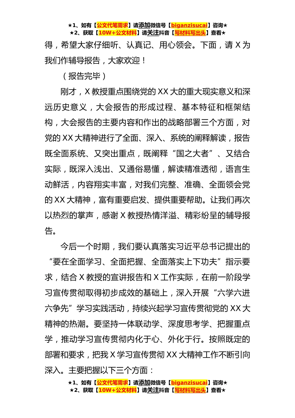 ★1、如有【公文代笔需求】请添加微信号【biganzisucai】咨询★★2、获取【10W+公文材料】请关注抖音【写材料写出头】查看★在党的二十大精神宣讲报告会上的主持及讲话(**字)同志们:党的XX大是在全党全国各族人民迈上全面建设社会主义现代化国家新征程、向第二个百年奋斗目标进军的关键时刻召开的一次十分重要的大会。习近平总书记代表十九届中央委员会所作的报告,举旗定向、主题鲜明、思想深邃、内涵丰富,是谱写全面建设社会主义现代化国家新篇章的政治宣言和行动纲领,为党和国家事业树起了新的历史坐标,必将极大地激励全党全军全国各族人民奋进新征程、建功新时代,为实现中华民族伟大*而团结奋斗。为深入学习宣传贯彻党的XX大精神,切实把全X广大干部群众的思想和行动统一到会议精神上来,X组织了宣讲团...