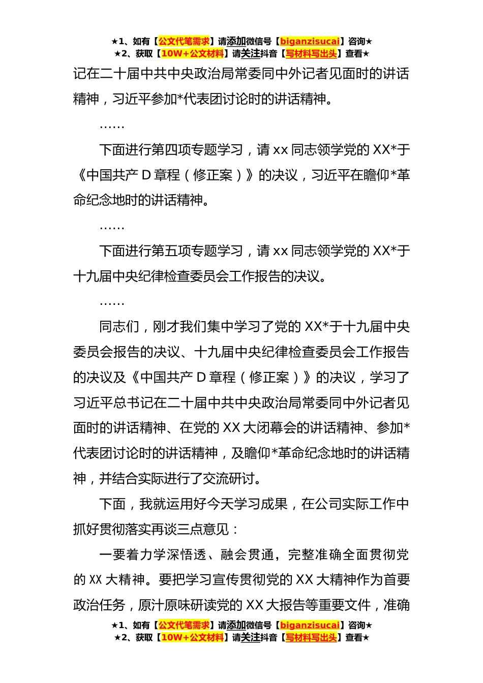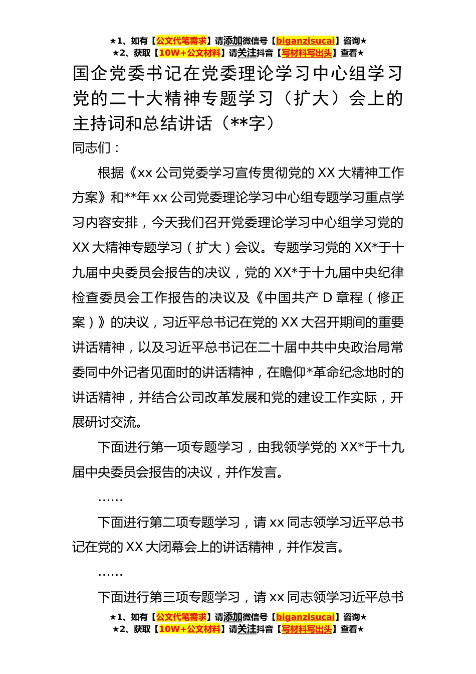 ★1、如有【公文代笔需求】请添加微信号【biganzisucai】咨询★★2、获取【10W+公文材料】请关注抖音【写材料写出头】查看★国企党委书记在党委理论学习中心组学习党的二十大精神专题学习(扩大)会上的主持词和总结讲话(**字)同志们:根据《xx公司党委学习宣传贯彻党的XX大精神工作方案》和**年xx公司党委理论学习中心组专题学习重点学习内容安排,今天我们召开党委理论学习中心组学习党的XX大精神专题学习(扩大)会议。专题学习党的XX*于十九届中央委员会报告的决议,党的XX*于十九届中央纪律检查委员会工作报告的决议及《中国共产D章程(修正案)》的决议,习近平总书记在党的XX大召开期间的重要讲话精神,以及习近平总书记在二十届中共中央政治局常委同中外记者见面时的讲话精神,在瞻仰*革命纪念地时的讲...