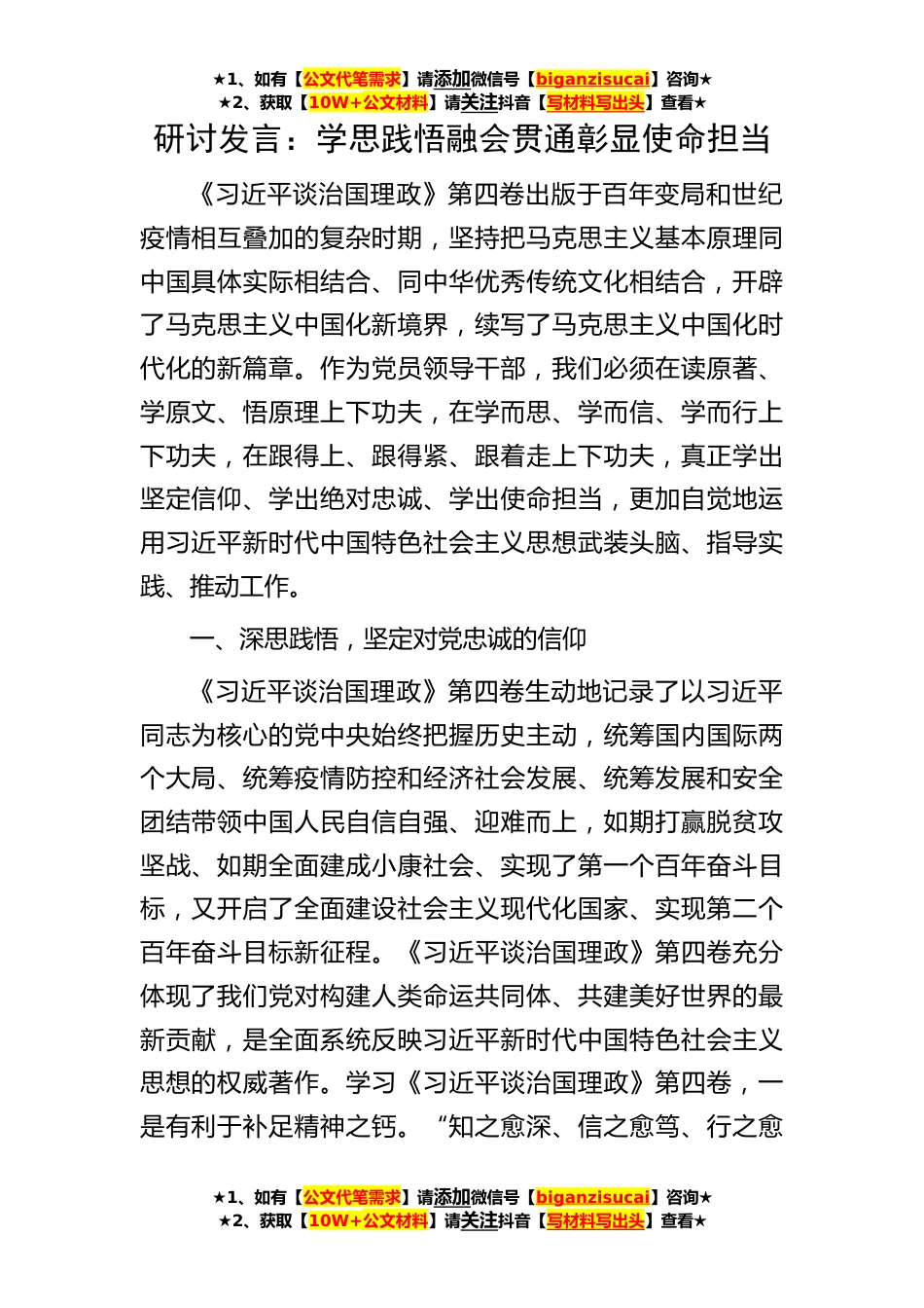 ★1、如有【公文代笔需求】请添加微信号【biganzisucai】咨询★★2、获取【10W+公文材料】请关注抖音【写材料写出头】查看★★1、如有【公文代笔需求】请添加微信号【biganzisucai】咨询★★2、获取【10W+公文材料】请关注抖音【写材料写出头】查看★★1、如有【公文代笔需求】请添加微信号【biganzisucai】咨询★★2、获取【10W+公文材料】请关注抖音【写材料写出头】查看★研讨发言:学思践悟融会贯通彰显使命担当《习近平谈治国理政》第四卷出版于百年变局和世纪疫情相互叠加的复杂时期,坚持把马克思主义基本原理同中国具体实际相结合、同中华优秀传统文化相结合,开辟了马克思主义中国化新境界,续写了马克思主义中国化时代化的新篇章。作为党员领导干部,我们必须在读原著、学原文、悟原理上下功夫,在学而...