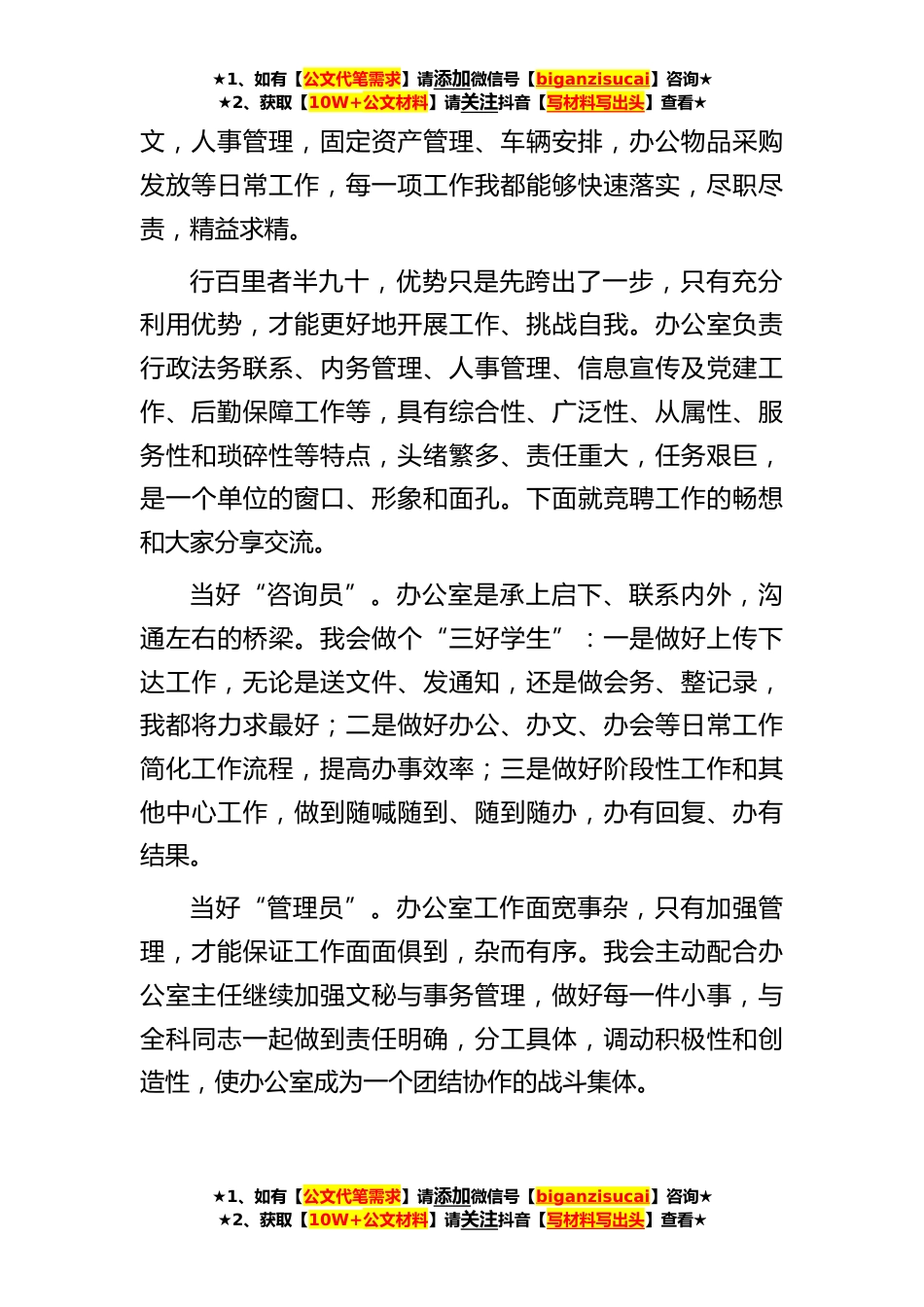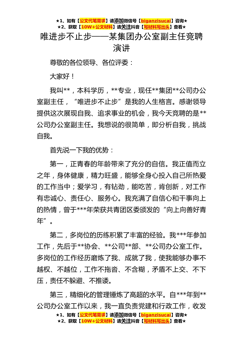 ★1、如有【公文代笔需求】请添加微信号【biganzisucai】咨询★★2、获取【10W+公文材料】请关注抖音【写材料写出头】查看★唯进步不止步——某集团办公室副主任竞聘演讲尊敬的各位领导、各位评委:大家好!我叫**,本科学历,**专业,现任**集团**公司办公室副主任,“唯进步不止步”是我的人生格言。感谢领导提供这次展现自我、追求事业的机会,我今天竞聘的是**公司办公室副主任。我想说的很简单,即分析自我,挑战自我。首先说一下我的优势:第一,正青春的年龄带来了充分的自信。我正值而立之年,身体健康,精力旺盛,能够全身心投入自己所热爱的工作当中;爱学习,有钻劲,能吃苦,肯创新,对工作有忠诚心、责任心、服务心。我充满了自信心和干事向上的热情,曾于***年荣获共青团区委颁发的“向上向善好青年...