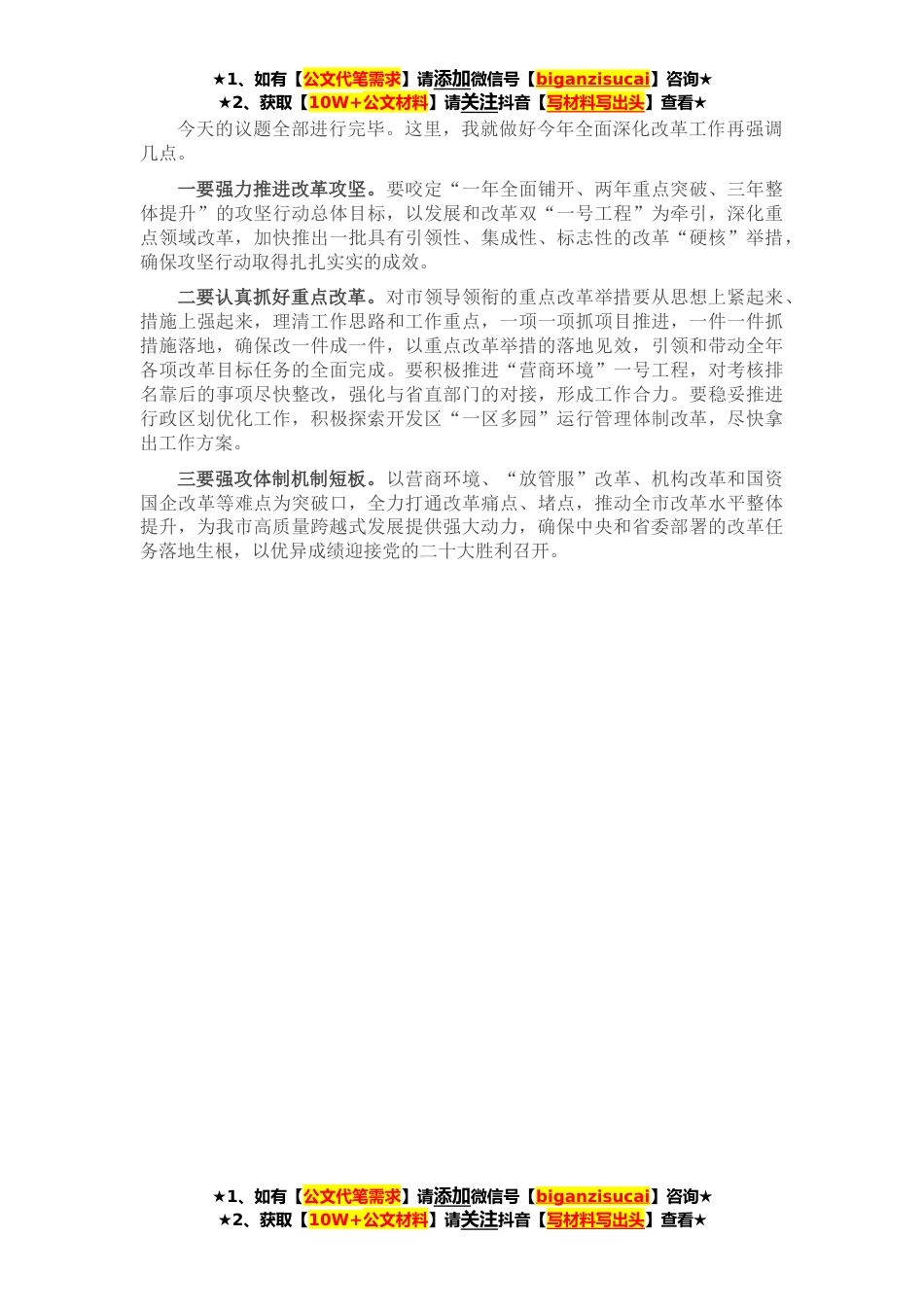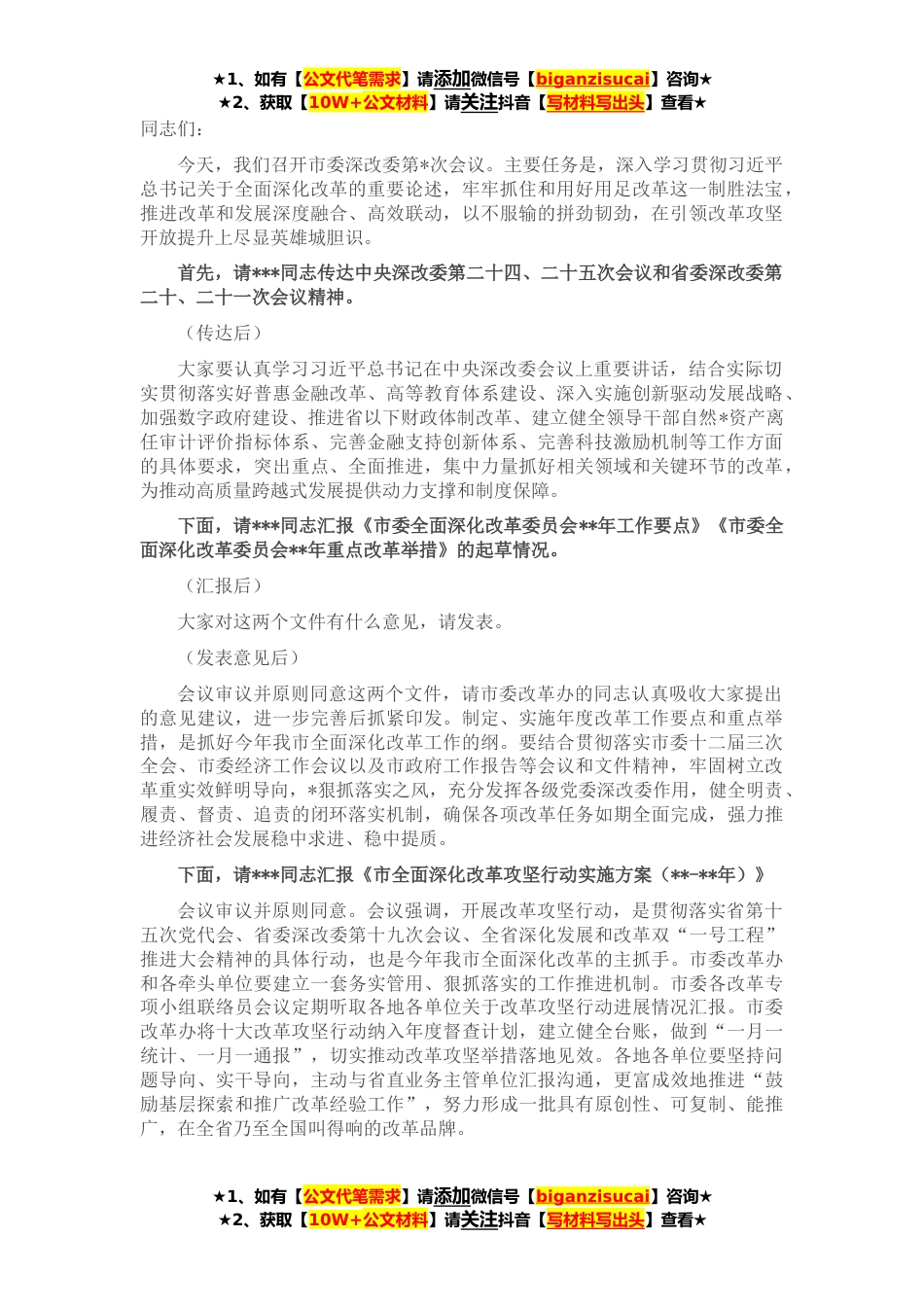 ★1、如有【公文代笔需求】请添加微信号【biganzisucai】咨询★★2、获取【10W+公文材料】请关注抖音【写材料写出头】查看★同志们:今天,我们召开市委深改委第*次会议。主要任务是,深入学习贯彻习近平总书记关于全面深化改革的重要论述,牢牢抓住和用好用足改革这一制胜法宝,推进改革和发展深度融合、高效联动,以不服输的拼劲韧劲,在引领改革攻坚开放提升上尽显英雄城胆识。首先,请***同志传达中央深改委第二十四、二十五次会议和省委深改委第二十、二十一次会议精神。(传达后)大家要认真学习习近平总书记在中央深改委会议上重要讲话,结合实际切实贯彻落实好普惠金融改革、高等教育体系建设、深入实施创新驱动发展战略、加强数字政府建设、推进省以下财政体制改革、建立健全领导干部自然*资产离任审计评...