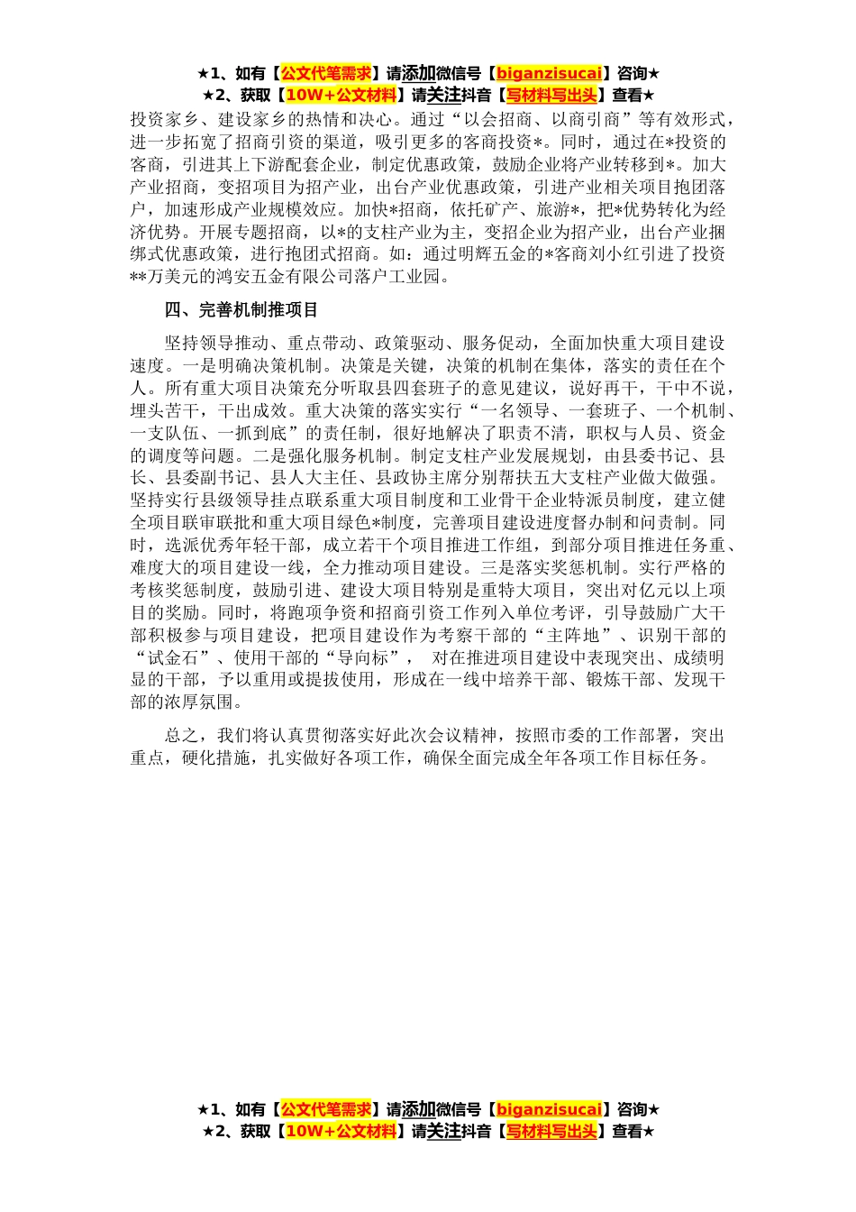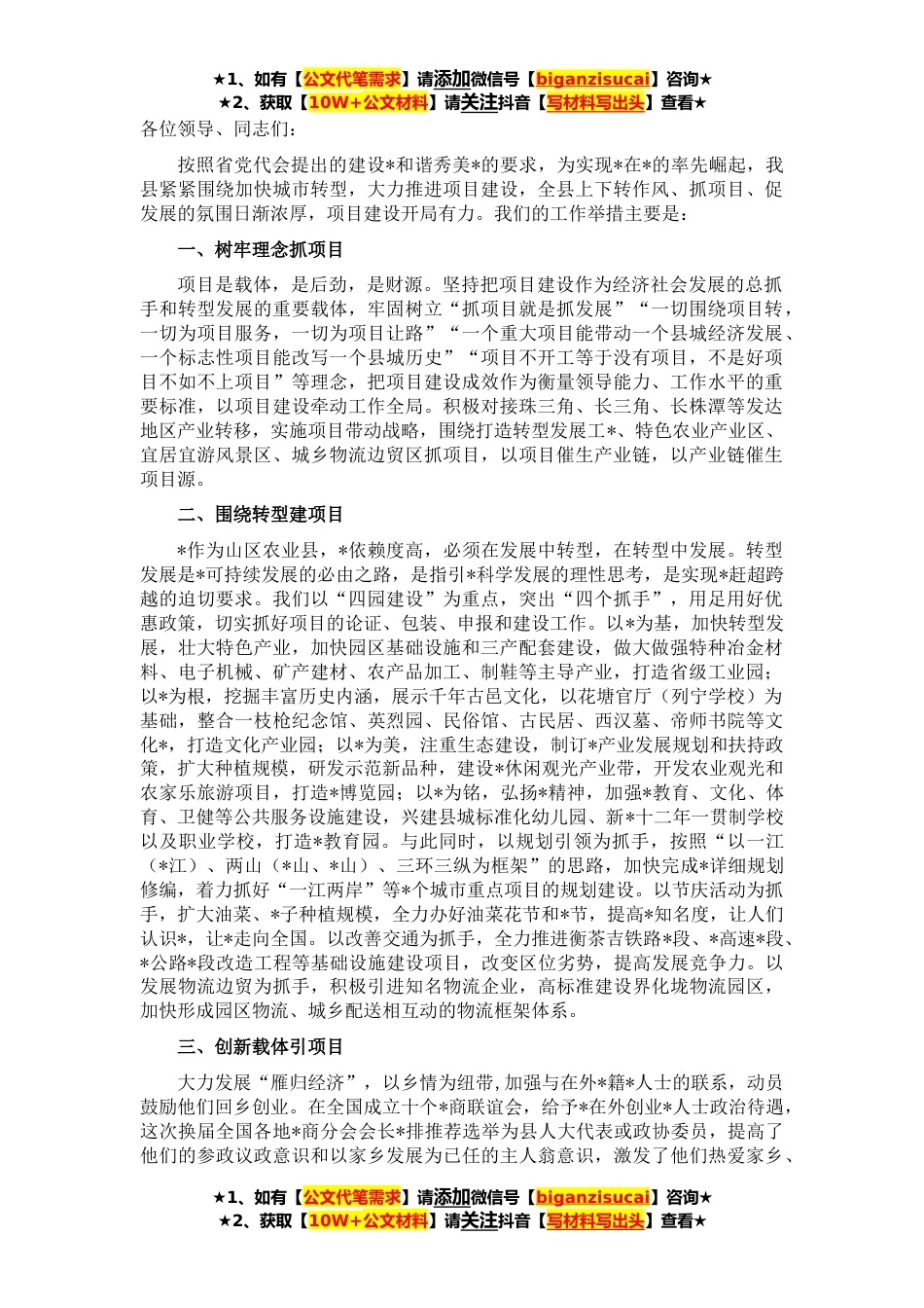 ★1、如有【公文代笔需求】请添加微信号【biganzisucai】咨询★★2、获取【10W+公文材料】请关注抖音【写材料写出头】查看★各位领导、同志们:按照省党代会提出的建设*和谐秀美*的要求,为实现*在*的率先崛起,我县紧紧围绕加快城市转型,大力推进项目建设,全县上下转作风、抓项目、促发展的氛围日渐浓厚,项目建设开局有力。我们的工作举措主要是:一、树牢理念抓项目项目是载体,是后劲,是财源。坚持把项目建设作为经济社会发展的总抓手和转型发展的重要载体,牢固树立“抓项目就是抓发展”“一切围绕项目转,一切为项目服务,一切为项目让路”“一个重大项目能带动一个县城经济发展、一个标志性项目能改写一个县城历史”“项目不开工等于没有项目,不是好项目不如不上项目”等理念,把项目建设成效作为衡量...