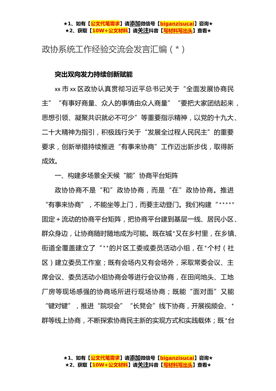 ★1、如有【公文代笔需求】请添加微信号【biganzisucai】咨询★★2、获取【10W+公文材料】请关注抖音【写材料写出头】查看★政协系统工作经验交流会发言汇编(*)突出双向发力持续创新赋能xx市xx区政协认真贯彻习近平总书记关于“全面发展协商民主”“有事好商量、众人的事情由众人商量”“要把大家团结起来,思想引领、凝聚共识就必不可少”等重要指示精神,以党的十九大、二十大精神为指引,积极践行关于“发展全过程人民民主”的重要要求,创新举措持续推进“有事来协商”工作迈出新步伐,取得新成效。一、构建多场景全天候“能”协商平台矩阵政协协商不是“和”政协协商,而是“在”政协协商。推进“有事来协商”,不能坐等上门,而要主动登门。我们构建“****”固定+流动的协商平台矩阵,把协商平台建到基层...