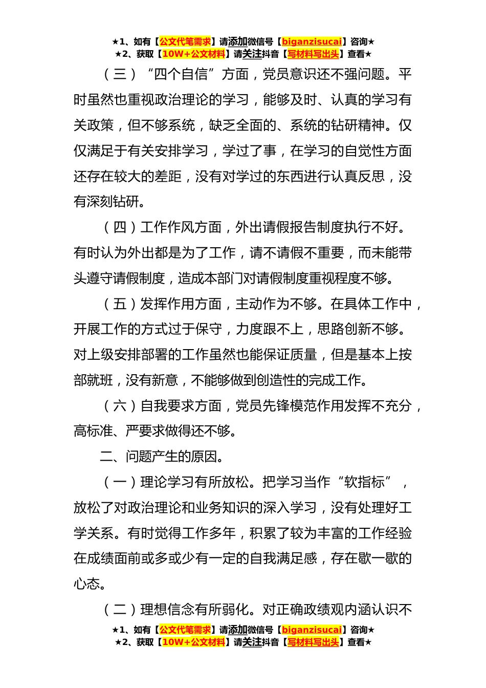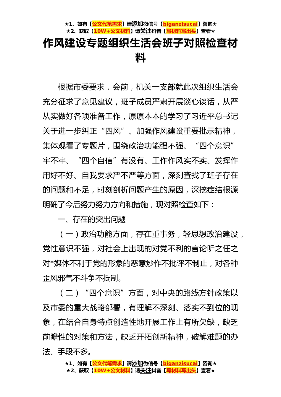 ★1、如有【公文代笔需求】请添加微信号【biganzisucai】咨询★★2、获取【10W+公文材料】请关注抖音【写材料写出头】查看★作风建设专题组织生活会班子对照检查材料根据市委要求,会前,机关一支部就此次组织生活会充分征求了意见建议,班子成员严肃开展谈心谈话,从严从实做好各项准备工作,原原本本的学习了习近平总书记关于进一步纠正“四风”、加强作风建设重要批示精神,集体观看了专题片,围绕政治功能强不强、“四个意识”牢不牢、“四个自信”有没有、工作作风实不实、发挥作用好不好、自我要求严不严等方面,深刻查找了班子存在的问题和不足,时刻剖析问题产生的原因,深挖症结根源明确了今后努力努力方向和措施,现对照检查如下:一、存在的突出问题(一)政治功能方面,存在重事务,轻思想政治建设,...