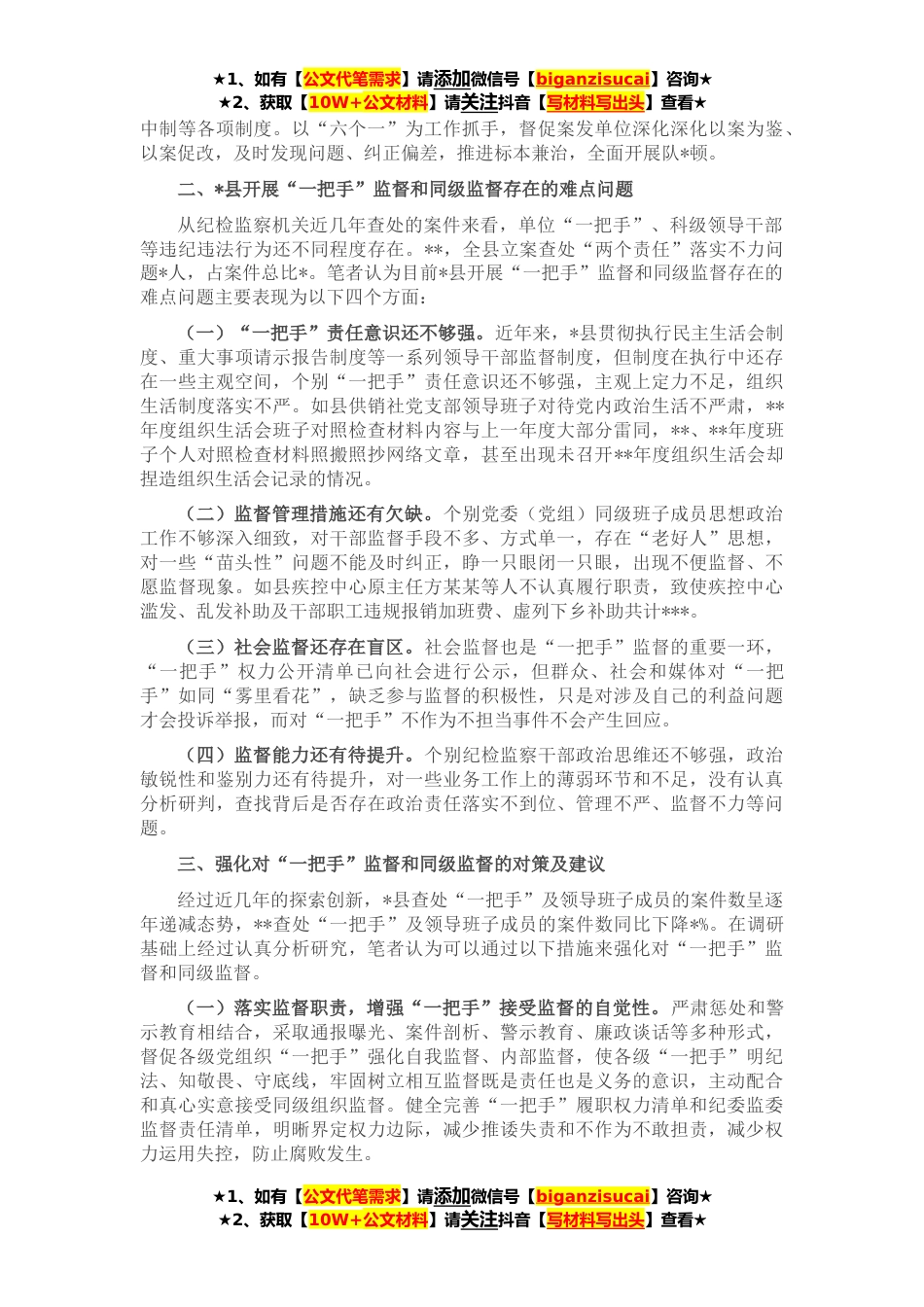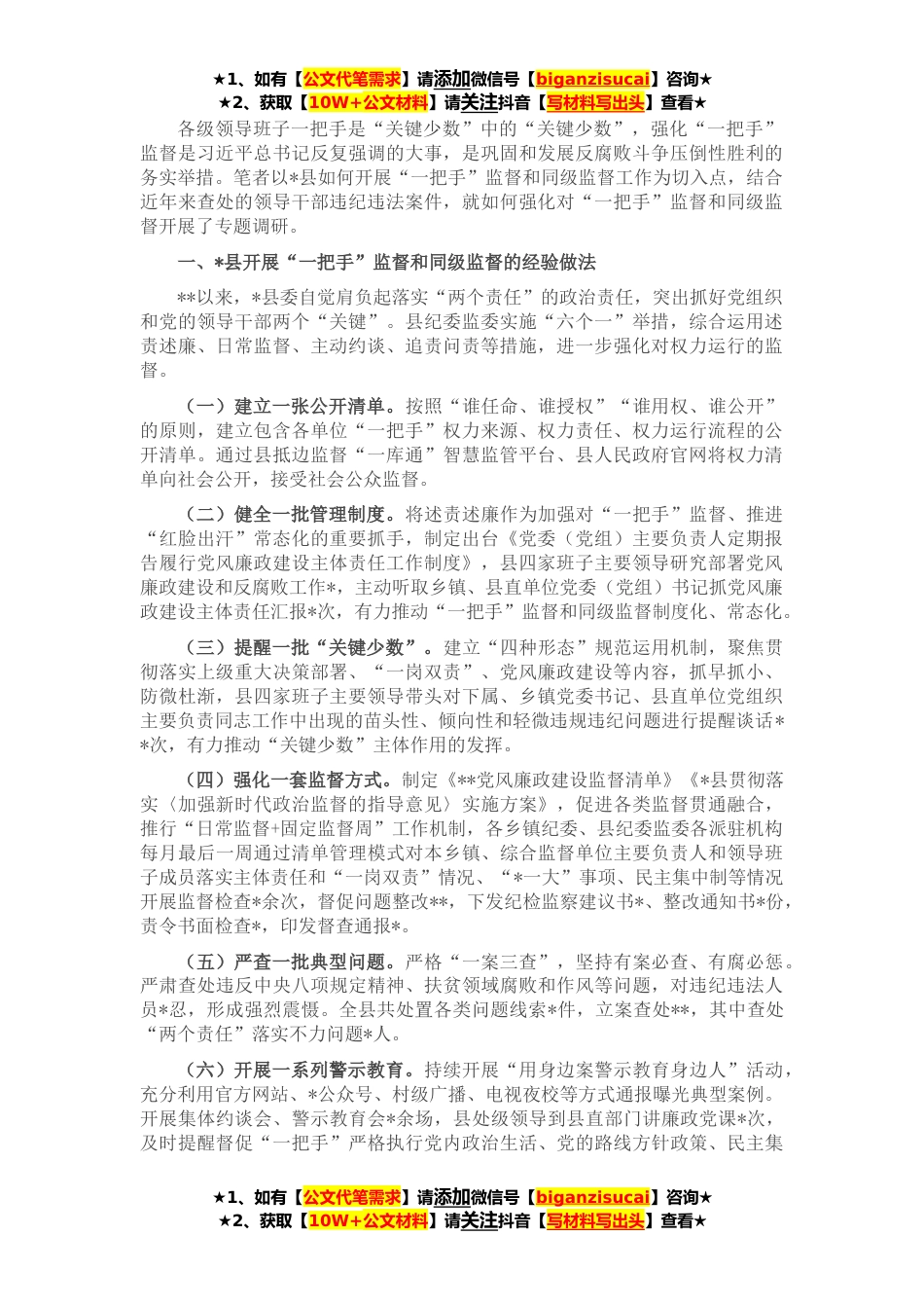 ★1、如有【公文代笔需求】请添加微信号【biganzisucai】咨询★★2、获取【10W+公文材料】请关注抖音【写材料写出头】查看★各级领导班子一把手是“关键少数”中的“关键少数”,强化“一把手”监督是习近平总书记反复强调的大事,是巩固和发展反腐败斗争压倒性胜利的务实举措。笔者以*县如何开展“一把手”监督和同级监督工作为切入点,结合近年来查处的领导干部违纪违法案件,就如何强化对“一把手”监督和同级监督开展了专题调研。一、*县开展“一把手”监督和同级监督的经验做法**以来,*县委自觉肩负起落实“两个责任”的政治责任,突出抓好党组织和党的领导干部两个“关键”。县纪委监委实施“六个一”举措,综合运用述责述廉、日常监督、主动约谈、追责问责等措施,进一步强化对权力运行的监督。(一)建立...