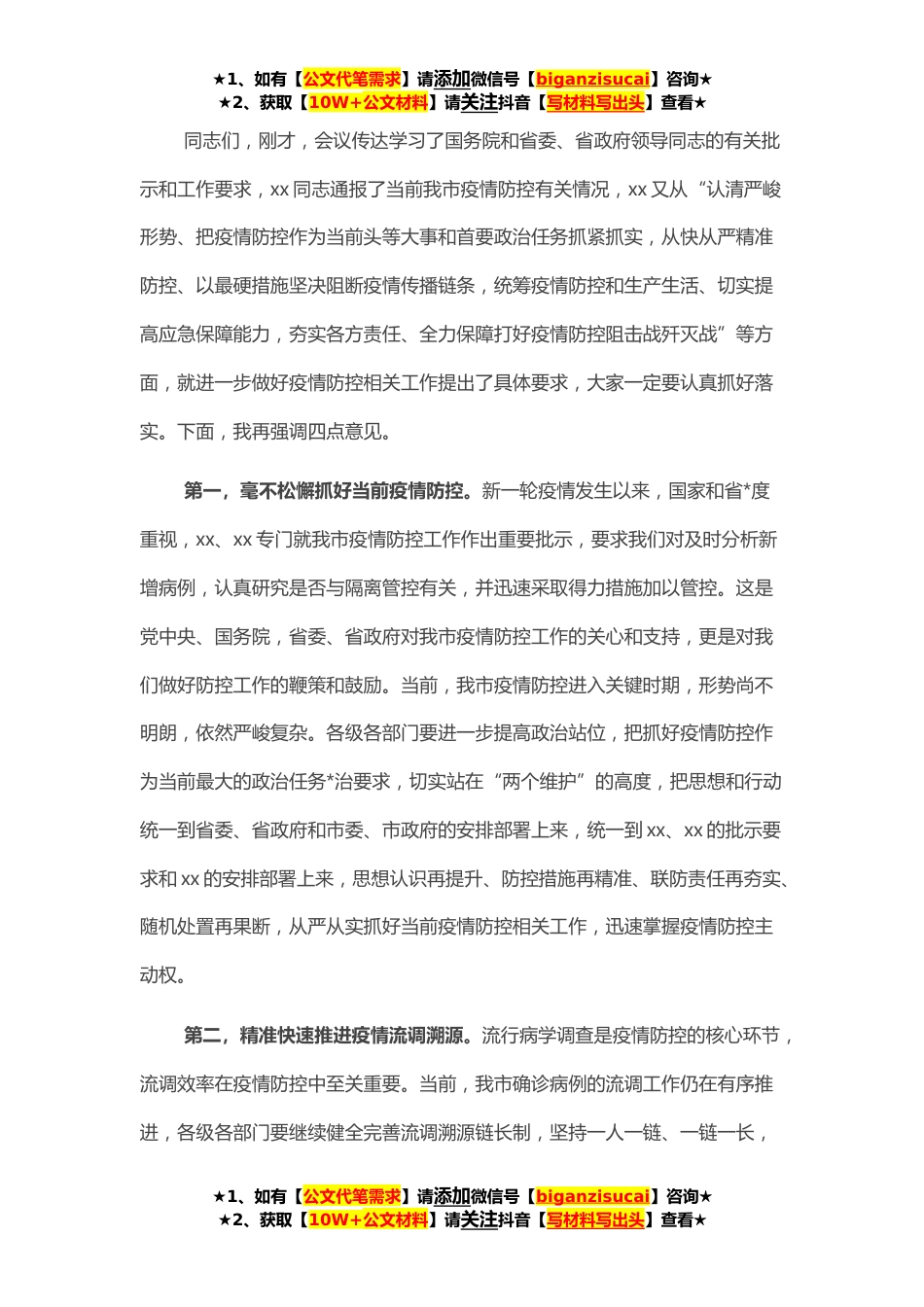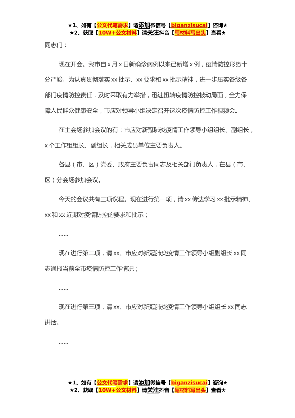 ★1、如有【公文代笔需求】请添加微信号【biganzisucai】咨询★★2、获取【10W+公文材料】请关注抖音【写材料写出头】查看★同志们:现在开会。我市自x月x日新确诊病例以来已新增x例,疫情防控形势十分严峻。为认真贯彻落实xx批示、xx要求和xx批示精神,进一步压实各级各部门疫情防控责任,及时采取有力举措,迅速扭转疫情防控被动局面,全力保障人民群众健康安全,市应对领导小组决定召开这次疫情防控工作视频会。在主会场参加会议的有:市应对新冠肺炎疫情工作领导小组组长、副组长,x个工作组组长、副组长,相关成员单位主要负责人。各县(市、区)党委、政府主要负责同志及相关部门负责人,在县(市、区)分会场参加会议。今天的会议共有三项议程。现在进行第一项,请xx传达学习xx批示精神、xx和xx近期对疫情...