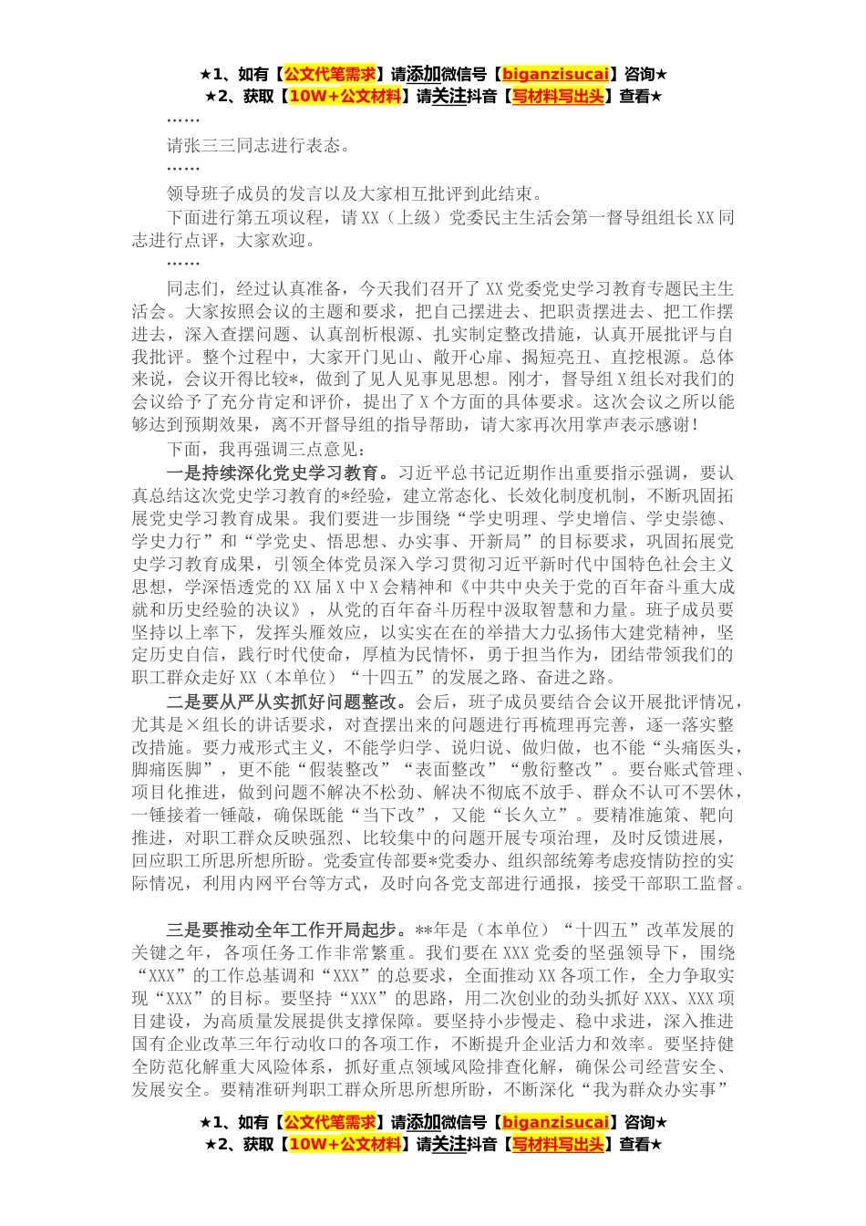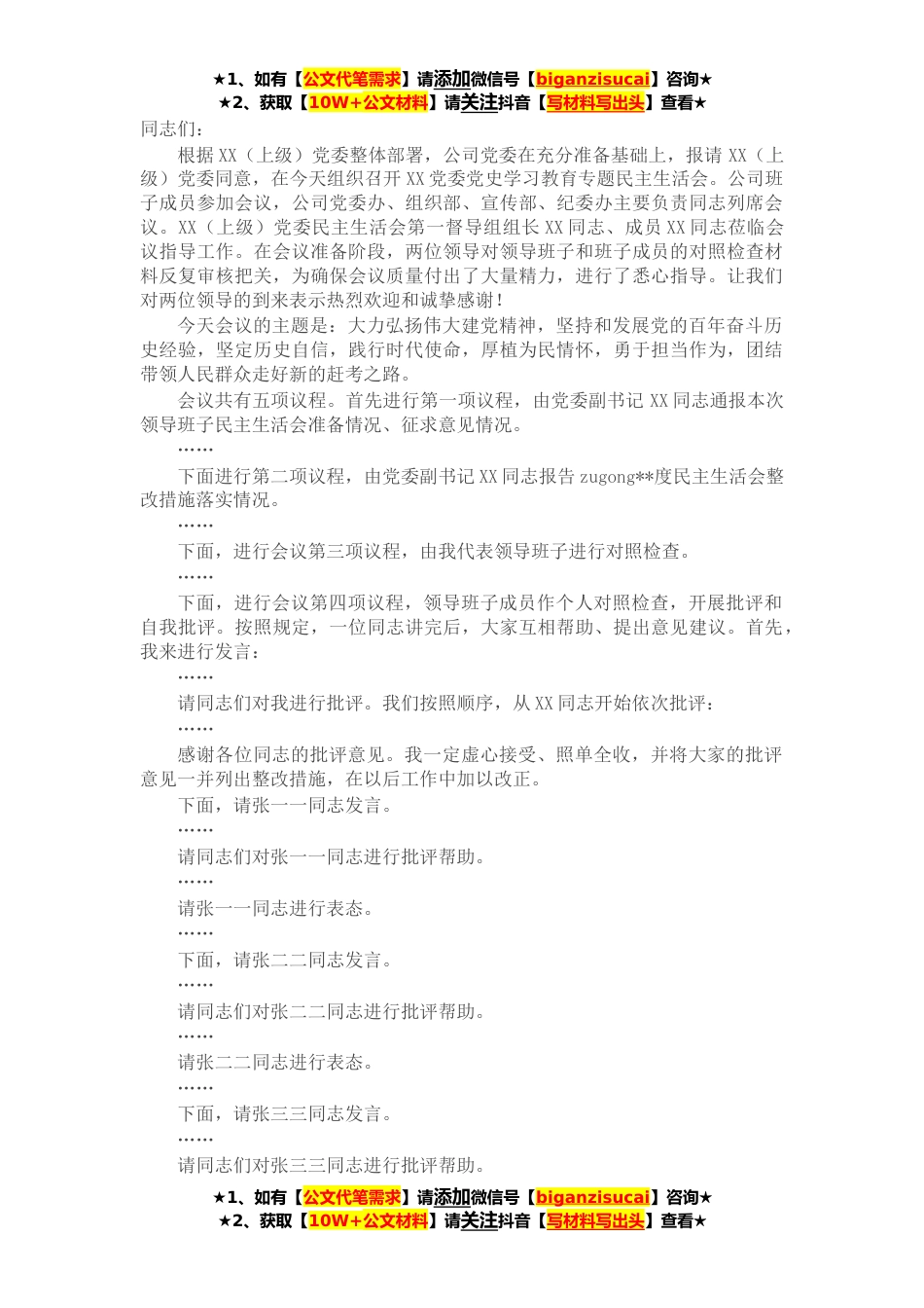 ★1、如有【公文代笔需求】请添加微信号【biganzisucai】咨询★★2、获取【10W+公文材料】请关注抖音【写材料写出头】查看★同志们:根据XX(上级)党委整体部署,公司党委在充分准备基础上,报请XX(上级)党委同意,在今天组织召开XX党委党史学习教育专题民主生活会。公司班子成员参加会议,公司党委办、组织部、宣传部、纪委办主要负责同志列席会议。XX(上级)党委民主生活会第一督导组组长XX同志、成员XX同志莅临会议指导工作。在会议准备阶段,两位领导对领导班子和班子成员的对照检查材料反复审核把关,为确保会议质量付出了大量精力,进行了悉心指导。让我们对两位领导的到来表示热烈欢迎和诚挚感谢!今天会议的主题是:大力弘扬伟大建党精神,坚持和发展党的百年奋斗历史经验,坚定历史自信,践行时代使...