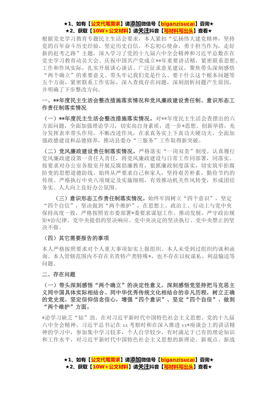 ★1、如有【公文代笔需求】请添加微信号【biganzisucai】咨询★★2、获取【10W+公文材料】请关注抖音【写材料写出头】查看★根据党史学习教育专题民主生活会要求,本人紧扣“弘扬伟大建党精神,坚持党的百年奋斗历史经验,坚定历史自信,不忘初心使命,勇于担当作为,走好新的赶考之路”主题,深入学习了党的十九届六中全会精神和习近平总数在在党史学习教育动员大会、庆祝中国共产党成立**年重要讲话精,紧密联系思想、工作和作风实际,扎实开展谈心谈话、广泛征求意见建议,聚焦带头深刻感悟“两个确立”的重要意义、带头牢记我们党是什么、要干什么这个根本问题等五个方面,紧密联系工作实际,深入查找存在问题,深刻剖析问题产生原因,并明确了下步整改方向。一、**年度民主生活会整改措施落实情况和党风廉政...