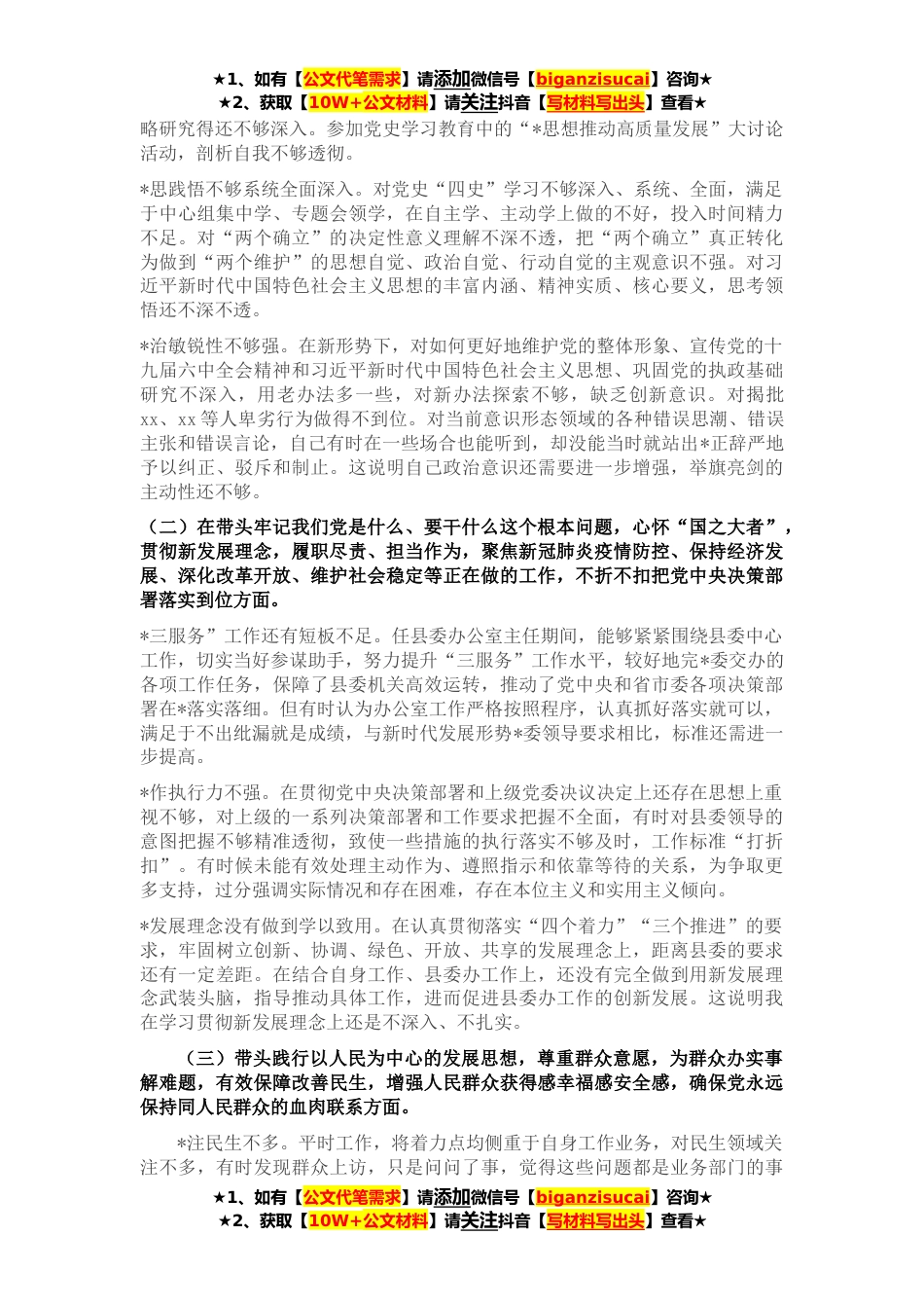 县委办公室主任党史学习教育专题民主生活会对照检查发言材料