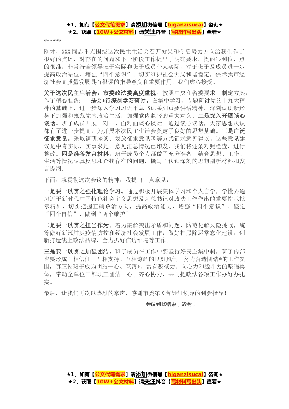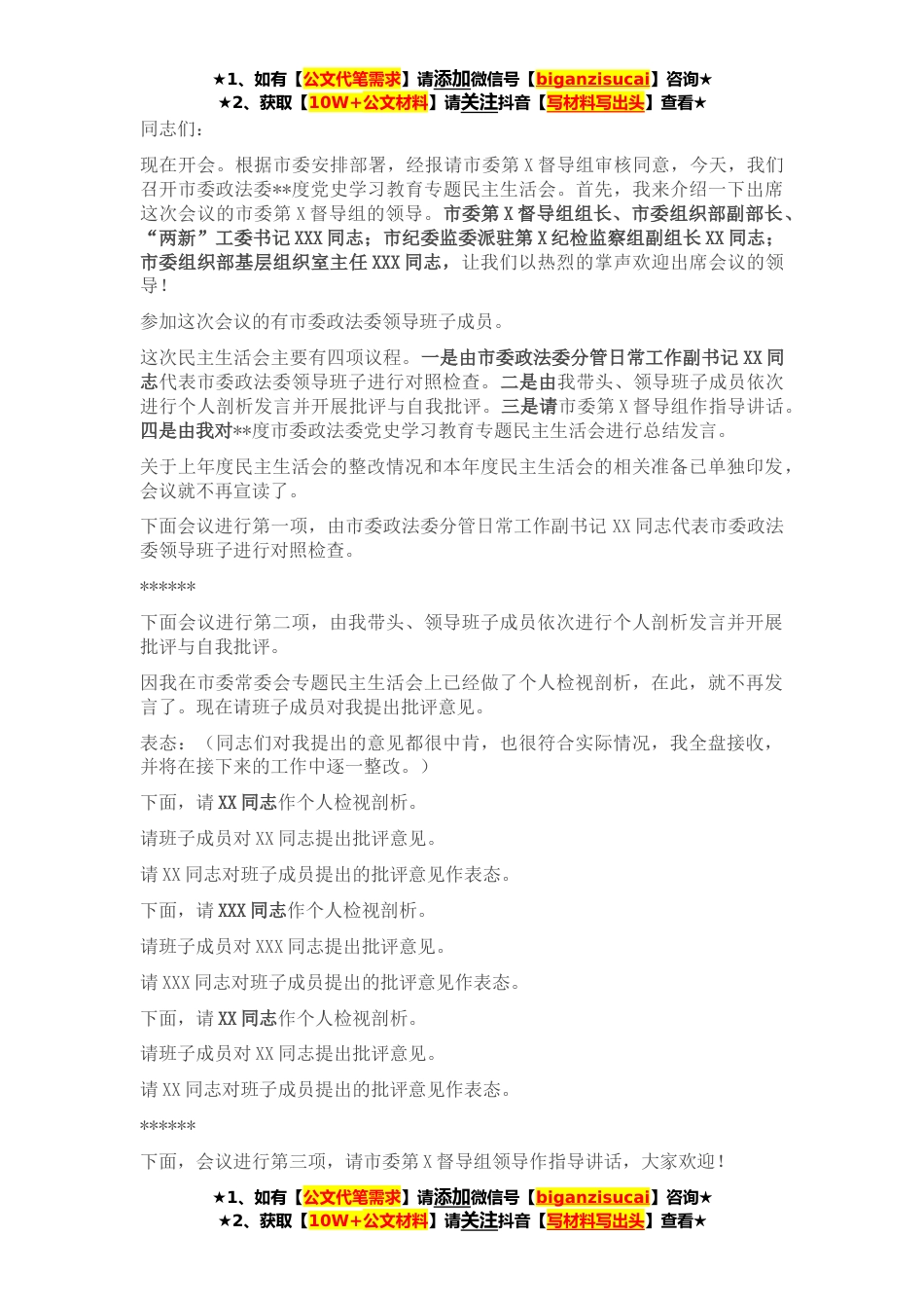 ★1、如有【公文代笔需求】请添加微信号【biganzisucai】咨询★★2、获取【10W+公文材料】请关注抖音【写材料写出头】查看★同志们:现在开会。根据市委安排部署,经报请市委第X督导组审核同意,今天,我们召开市委政法委**度党史学习教育专题民主生活会。首先,我来介绍一下出席这次会议的市委第X督导组的领导。市委第X督导组组长、市委组织部副部长、“两新”工委书记XXX同志;市纪委监委派驻第X纪检监察组副组长XX同志;市委组织部基层组织室主任XXX同志,让我们以热烈的掌声欢迎出席会议的领导!参加这次会议的有市委政法委领导班子成员。这次民主生活会主要有四项议程。一是由市委政法委分管日常工作副书记XX同志代表市委政法委领导班子进行对照检查。二是由我带头、领导班子成员依次进行个人剖析发言并开展...