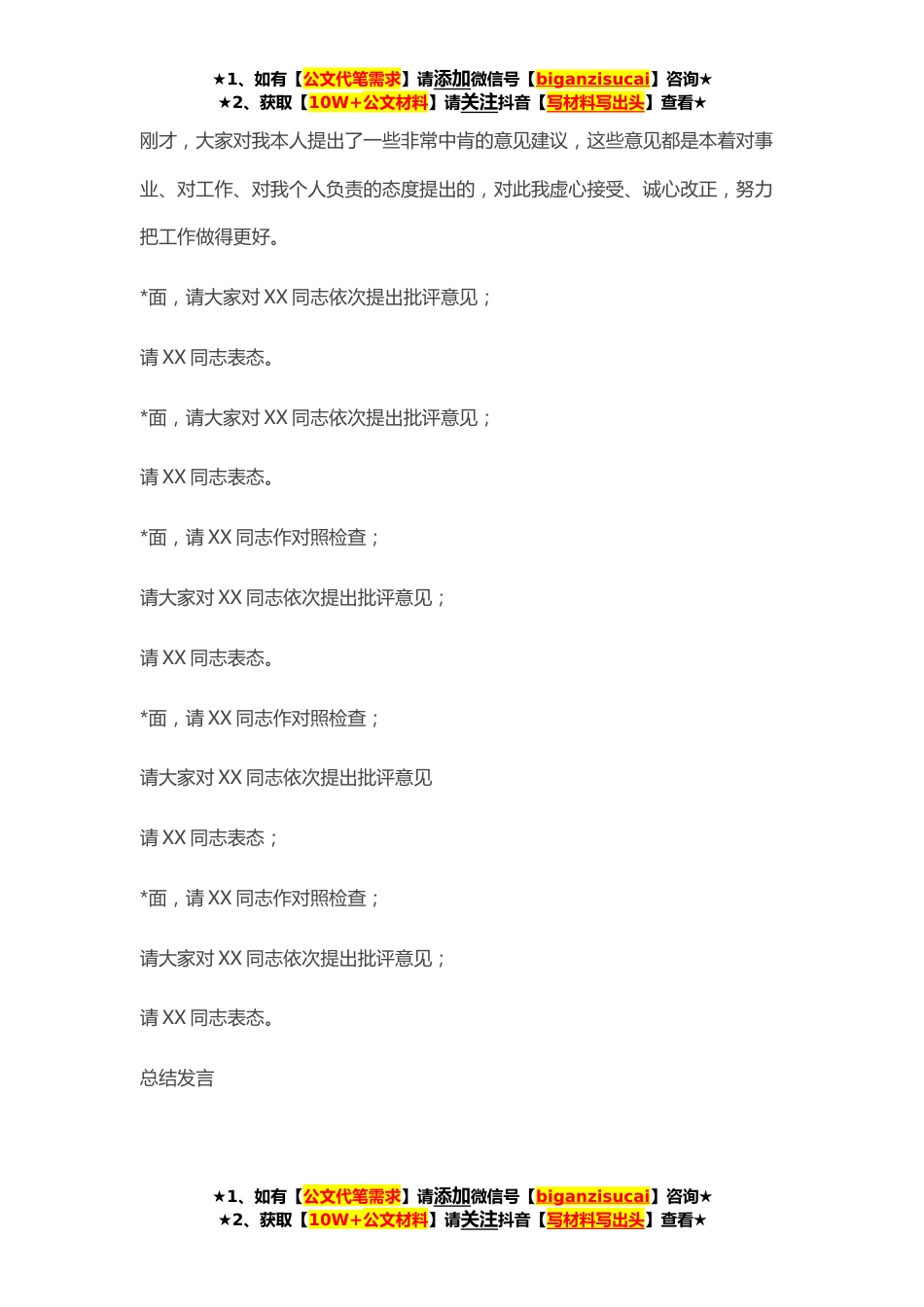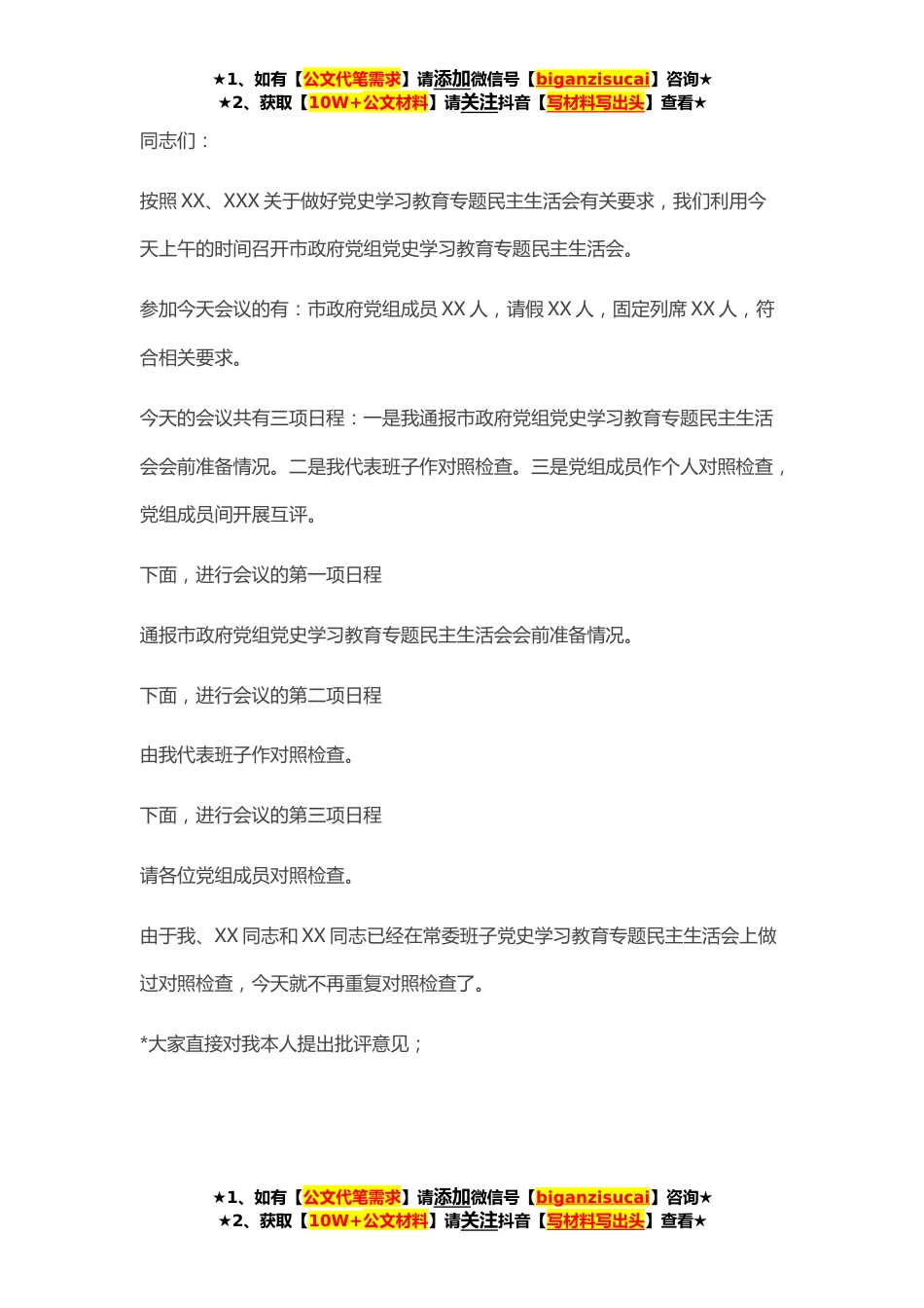 ★1、如有【公文代笔需求】请添加微信号【biganzisucai】咨询★★2、获取【10W+公文材料】请关注抖音【写材料写出头】查看★同志们:按照XX、XXX关于做好党史学习教育专题民主生活会有关要求,我们利用今天上午的时间召开市政府党组党史学习教育专题民主生活会。参加今天会议的有:市政府党组成员XX人,请假XX人,固定列席XX人,符合相关要求。今天的会议共有三项日程:一是我通报市政府党组党史学习教育专题民主生活会会前准备情况。二是我代表班子作对照检查。三是党组成员作个人对照检查,党组成员间开展互评。下面,进行会议的第一项日程通报市政府党组党史学习教育专题民主生活会会前准备情况。下面,进行会议的第二项日程由我代表班子作对照检查。下面,进行会议的第三项日程请各位党组成员对照检查。由于我...