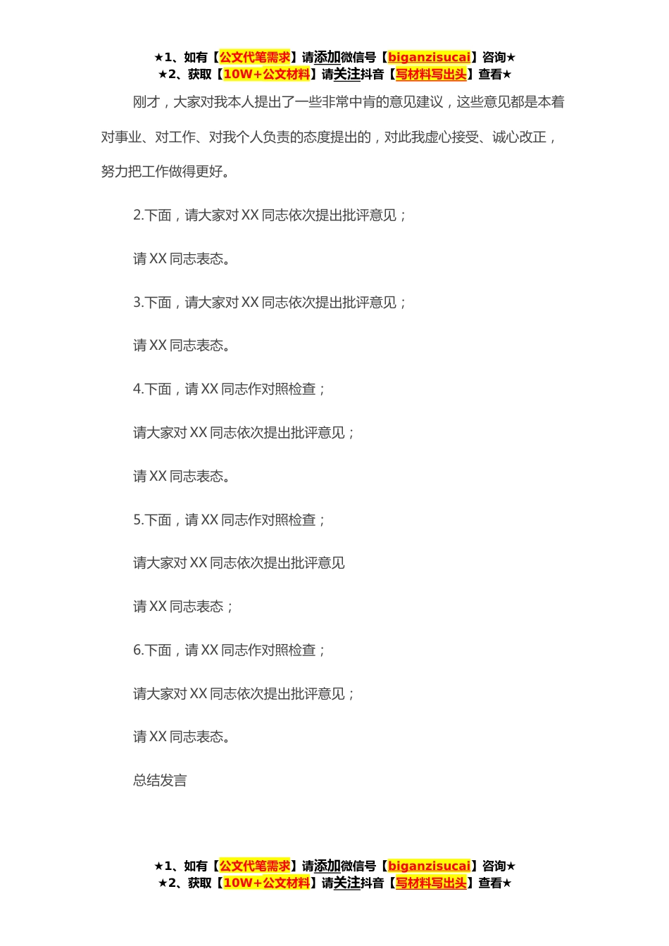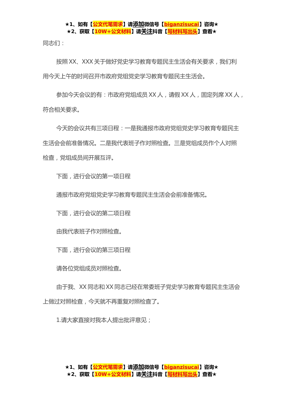 ★1、如有【公文代笔需求】请添加微信号【biganzisucai】咨询★★2、获取【10W+公文材料】请关注抖音【写材料写出头】查看★同志们:按照XX、XXX关于做好党史学习教育专题民主生活会有关要求,我们利用今天上午的时间召开市政府党组党史学习教育专题民主生活会。参加今天会议的有:市政府党组成员XX人,请假XX人,固定列席XX人,符合相关要求。今天的会议共有三项日程:一是我通报市政府党组党史学习教育专题民主生活会会前准备情况。二是我代表班子作对照检查。三是党组成员作个人对照检查,党组成员间开展互评。下面,进行会议的第一项日程通报市政府党组党史学习教育专题民主生活会会前准备情况。下面,进行会议的第二项日程由我代表班子作对照检查。下面,进行会议的第三项日程请各位党组成员对照检查。由于我...