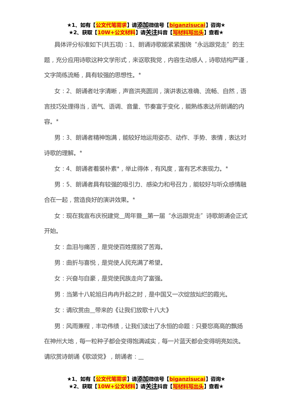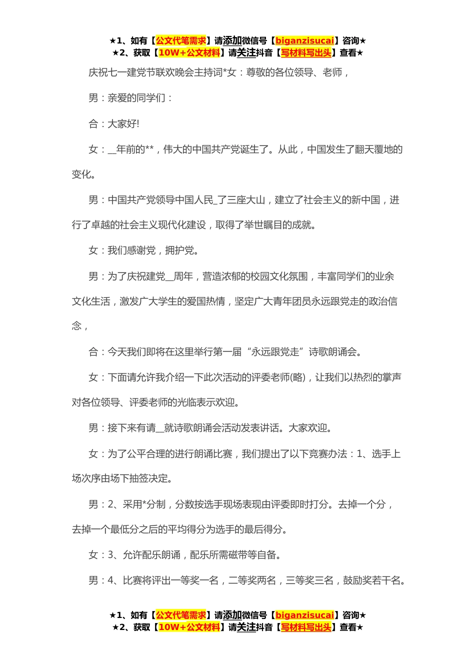 ★1、如有【公文代笔需求】请添加微信号【biganzisucai】咨询★★2、获取【10W+公文材料】请关注抖音【写材料写出头】查看★庆祝七一建党节联欢晚会主持词*女:尊敬的各位领导、老师,男:亲爱的同学们:合:大家好!女:__年前的**,伟大的中国共产党诞生了。从此,中国发生了翻天覆地的变化。男:中国共产党领导中国人民_了三座大山,建立了社会主义的新中国,进行了卓越的社会主义现代化建设,取得了举世瞩目的成就。女:我们感谢党,拥护党。男:为了庆祝建党__周年,营造浓郁的校园文化氛围,丰富同学们的业余文化生活,激发广大学生的爱国热情,坚定广大青年团员永远跟党走的政治信念,合:今天我们即将在这里举行第一届“永远跟党走”诗歌朗诵会。女:下面请允许我介绍一下此次活动的评委老师(略),让我们以...