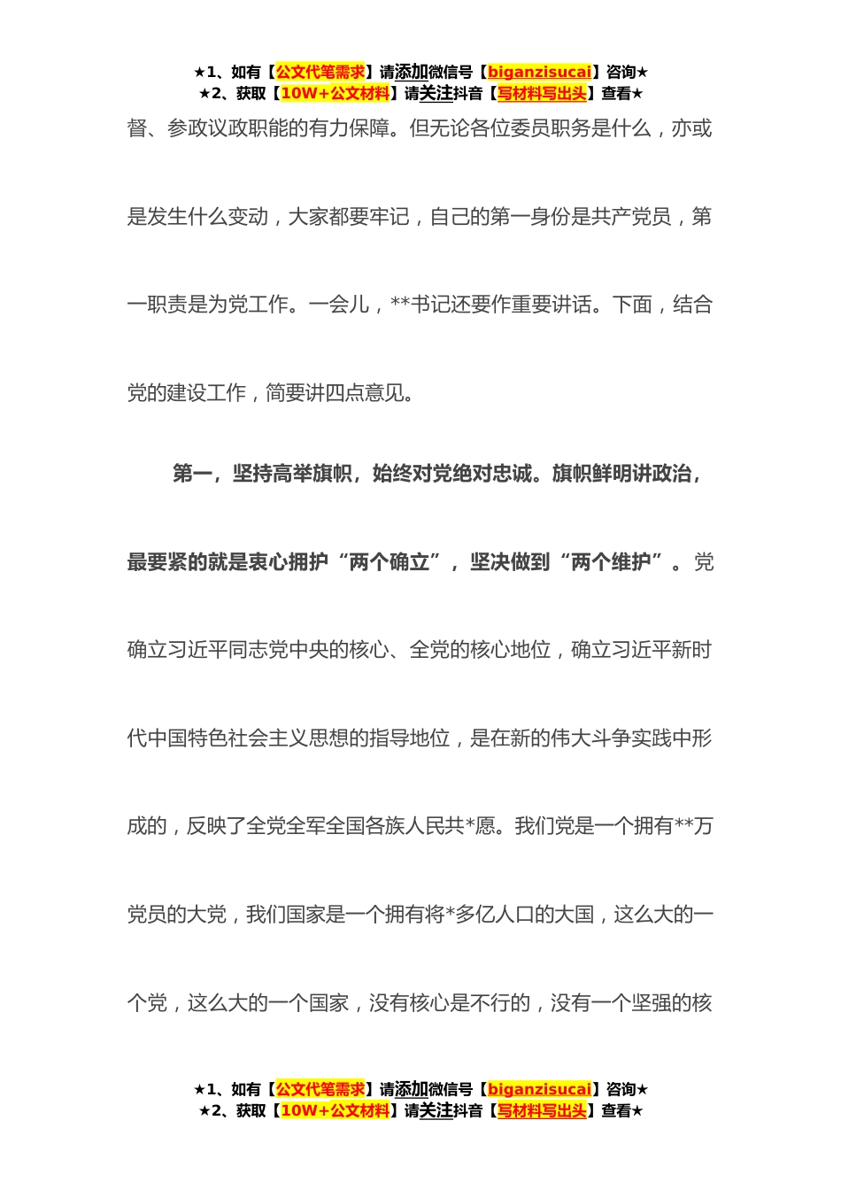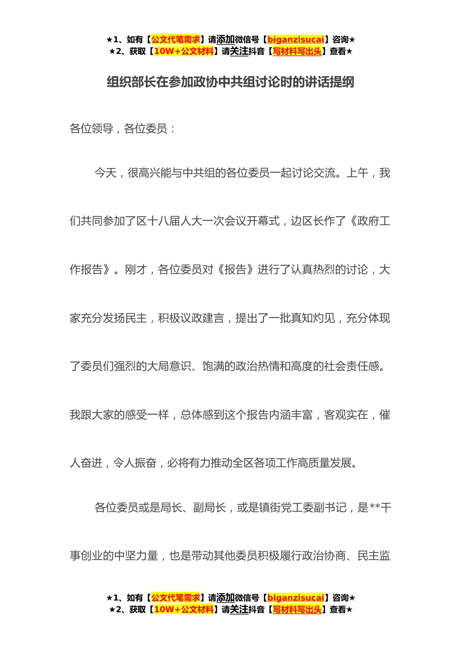 ★1、如有【公文代笔需求】请添加微信号【biganzisucai】咨询★★2、获取【10W+公文材料】请关注抖音【写材料写出头】查看★组织部长在参加政协中共组讨论时的讲话提纲各位领导,各位委员:今天,很高兴能与中共组的各位委员一起讨论交流。上午,我们共同参加了区十八届人大一次会议开幕式,边区长作了《政府工作报告》。刚才,各位委员对《报告》进行了认真热烈的讨论,大家充分发扬民主,积极议政建言,提出了一批真知灼见,充分体现了委员们强烈的大局意识、饱满的政治热情和高度的社会责任感。我跟大家的感受一样,总体感到这个报告内涵丰富,客观实在,催人奋进,令人振奋,必将有力推动全区各项工作高质量发展。各位委员或是局长、副局长,或是镇街党工委副书记,是**干事创业的中坚力量,也是带动其他委员...