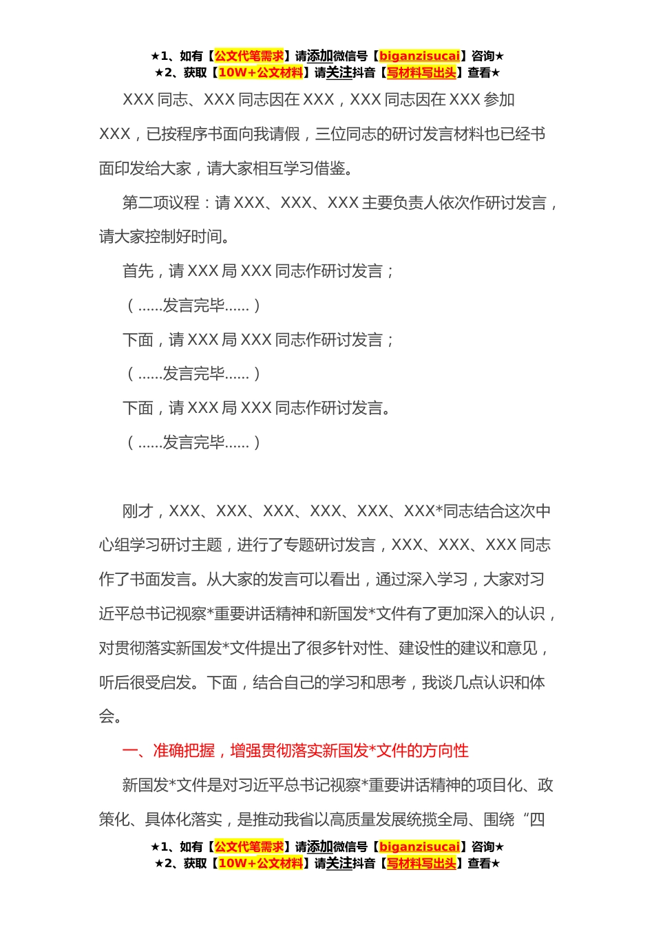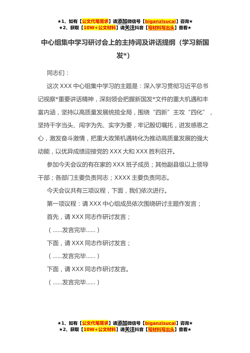 ★1、如有【公文代笔需求】请添加微信号【biganzisucai】咨询★★2、获取【10W+公文材料】请关注抖音【写材料写出头】查看★中心组集中学习研讨会上的主持词及讲话提纲(学习新国发*)同志们:这次XXX中心组集中学习的主题是:深入学习贯彻习近平总书记视察*重要讲话精神,深刻领会把握新国发*文件的重大机遇和丰富内涵,坚持以高质量发展统揽全局,围绕“四新”主攻“四化”,坚持干字当头、闯字为先、实字为要,牢记殷切嘱托,迸发感恩之心,激发奋斗激情,把重大政策机遇转化为推动高质量发展的强大动能,以优异成绩迎接党的XXX大和XXX胜利召开。参加今天会议的有在家的XXX班子成员;其他副县级以上领导干部;各部门主要负责同志;XXXX主要负责同志。今天会议共有三项议程,下面,我们依次进行。第一项议程:请...