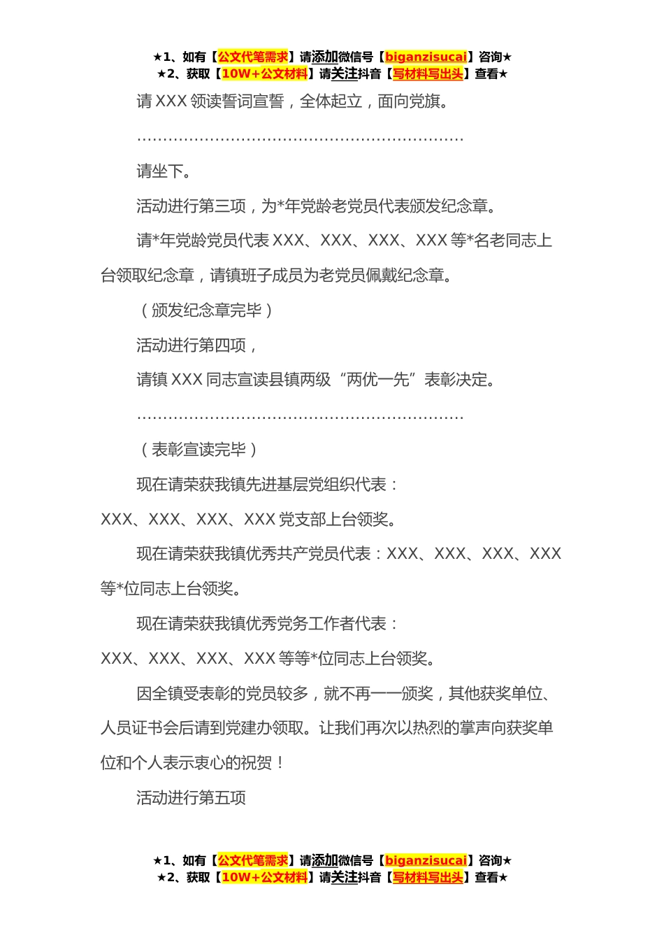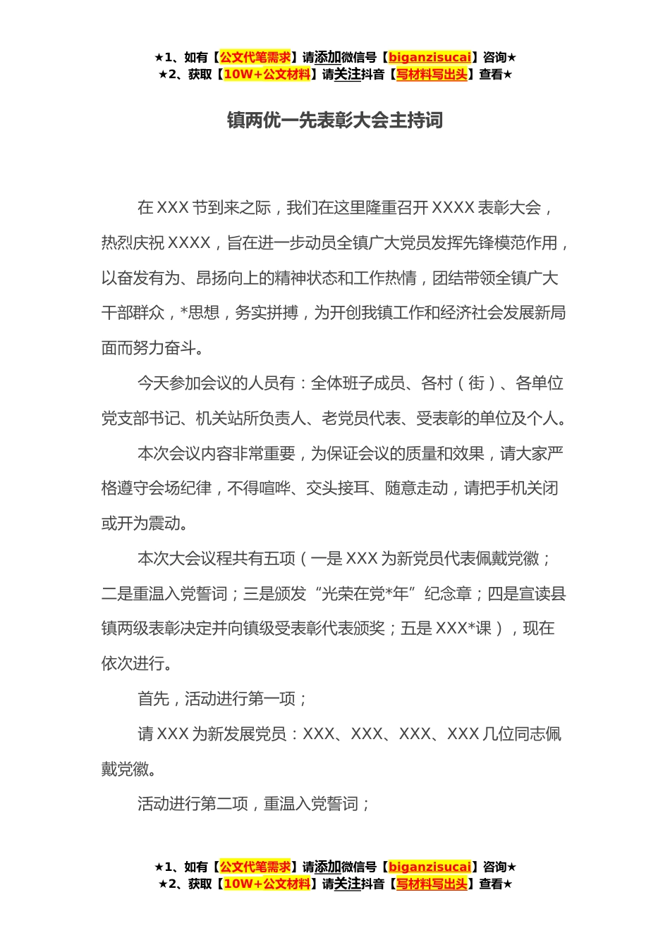 ★1、如有【公文代笔需求】请添加微信号【biganzisucai】咨询★★2、获取【10W+公文材料】请关注抖音【写材料写出头】查看★镇两优一先表彰大会主持词在XXX节到来之际,我们在这里隆重召开XXXX表彰大会,热烈庆祝XXXX,旨在进一步动员全镇广大党员发挥先锋模范作用,以奋发有为、昂扬向上的精神状态和工作热情,团结带领全镇广大干部群众,*思想,务实拼搏,为开创我镇工作和经济社会发展新局面而努力奋斗。今天参加会议的人员有:全体班子成员、各村(街)、各单位党支部书记、机关站所负责人、老党员代表、受表彰的单位及个人。本次会议内容非常重要,为保证会议的质量和效果,请大家严格遵守会场纪律,不得喧哗、交头接耳、随意走动,请把手机关闭或开为震动。本次大会议程共有五项(一是XXX为新党员代表佩戴党...