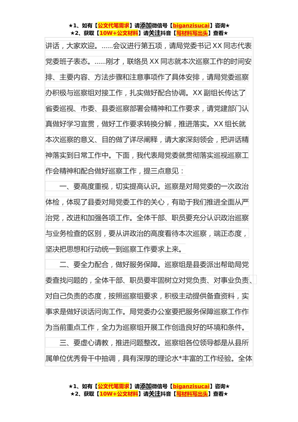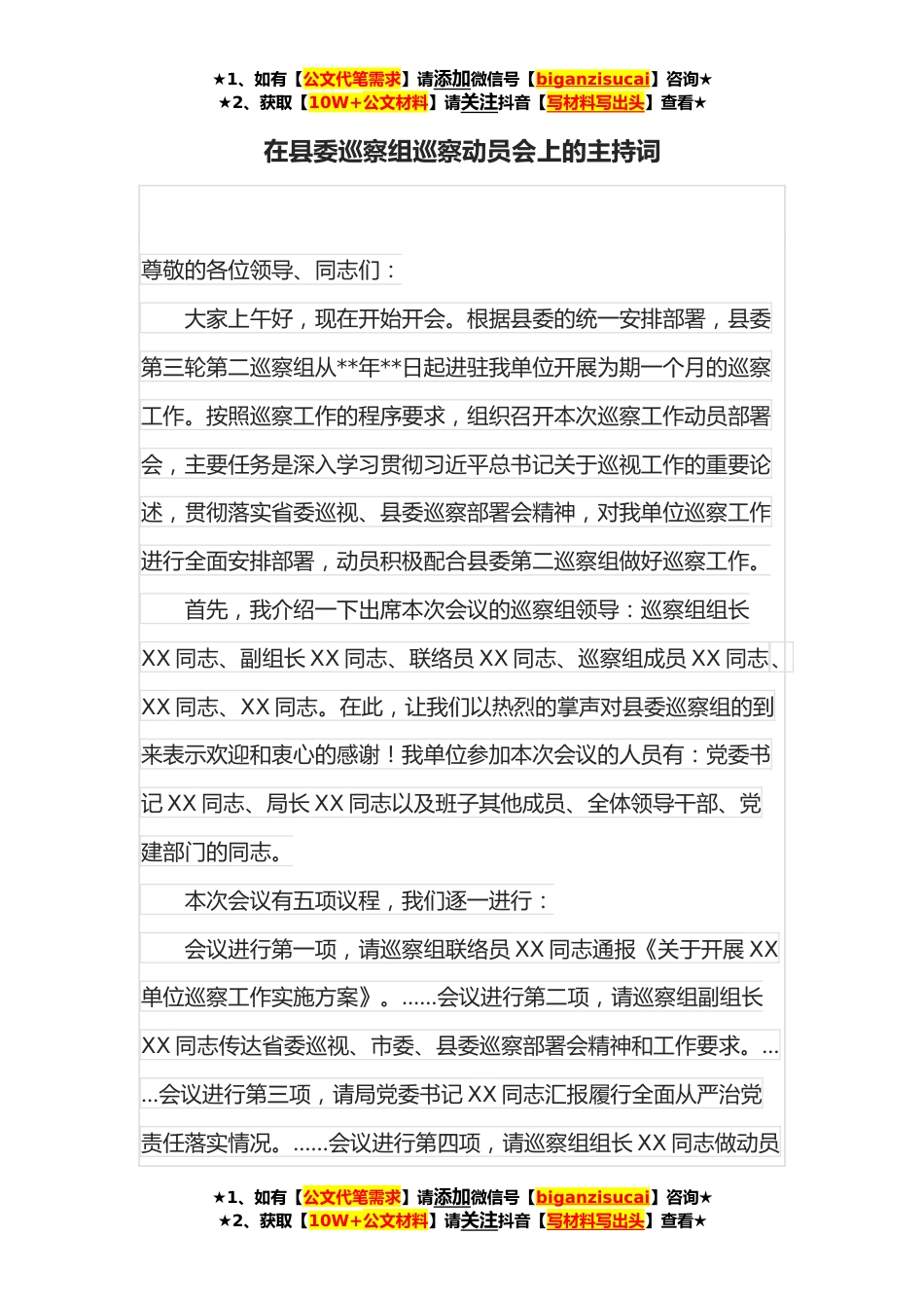 ★1、如有【公文代笔需求】请添加微信号【biganzisucai】咨询★★2、获取【10W+公文材料】请关注抖音【写材料写出头】查看★在县委巡察组巡察动员会上的主持词尊敬的各位领导、同志们:大家上午好,现在开始开会。根据县委的统一安排部署,县委第三轮第二巡察组从**年**日起进驻我单位开展为期一个月的巡察工作。按照巡察工作的程序要求,组织召开本次巡察工作动员部署会,主要任务是深入学习贯彻习近平总书记关于巡视工作的重要论述,贯彻落实省委巡视、县委巡察部署会精神,对我单位巡察工作进行全面安排部署,动员积极配合县委第二巡察组做好巡察工作。首先,我介绍一下出席本次会议的巡察组领导:巡察组组长XX同志、副组长XX同志、联络员XX同志、巡察组成员XX同志、XX同志、XX同志。在此,让我们以热烈的掌声...