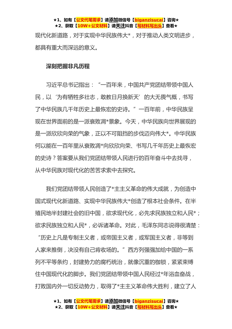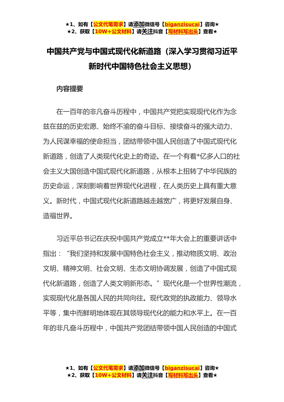 ★1、如有【公文代笔需求】请添加微信号【biganzisucai】咨询★★2、获取【10W+公文材料】请关注抖音【写材料写出头】查看★中国共产党与中国式现代化新道路(深入学习贯彻习近平新时代中国特色社会主义思想)内容提要在一百年的非凡奋斗历程中,中国共产党把实现现代化作为念兹在兹的历史宏愿、始终不渝的奋斗目标、接续奋斗的强大动力、为人民谋幸福的使命担当,团结带领中国人民创造了中国式现代化新道路,创造了人类现代化史上的奇迹。在一个有着*亿多人口的社会主义大国创造中国式现代化新道路,从根本上扭转了中华民族的历史命运,深刻影响着世界现代化进程,在人类历史上具有重大意义。新时代,中国式现代化新道路越走越宽广,将更好发展自身、造福世界。习近平总书记在庆祝中国共产党成立**年大会上的重要...
