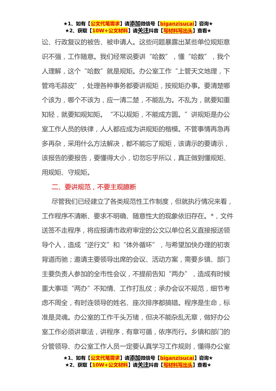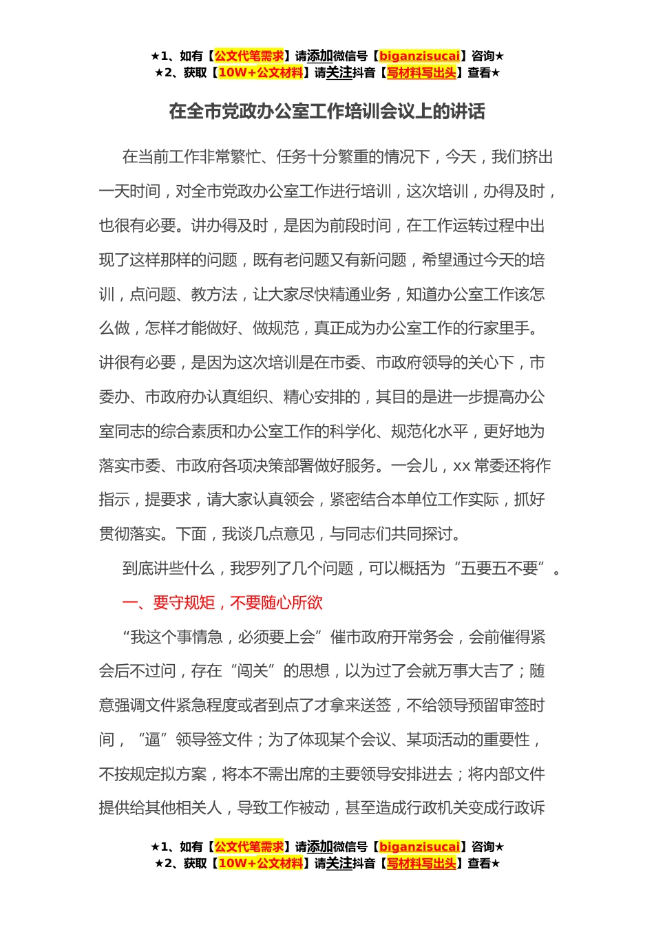 ★1、如有【公文代笔需求】请添加微信号【biganzisucai】咨询★★2、获取【10W+公文材料】请关注抖音【写材料写出头】查看★在全市党政办公室工作培训会议上的讲话在当前工作非常繁忙、任务十分繁重的情况下,今天,我们挤出一天时间,对全市党政办公室工作进行培训,这次培训,办得及时,也很有必要。讲办得及时,是因为前段时间,在工作运转过程中出现了这样那样的问题,既有老问题又有新问题,希望通过今天的培训,点问题、教方法,让大家尽快精通业务,知道办公室工作该怎么做,怎样才能做好、做规范,真正成为办公室工作的行家里手。讲很有必要,是因为这次培训是在市委、市政府领导的关心下,市委办、市政府办认真组织、精心安排的,其目的是进一步提高办公室同志的综合素质和办公室工作的科学化、规范化水...