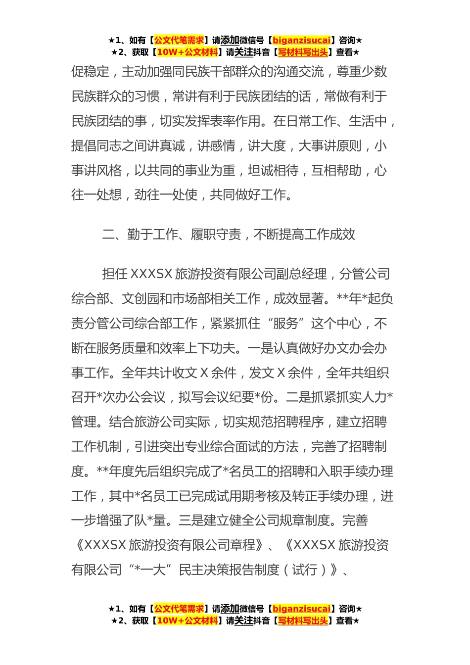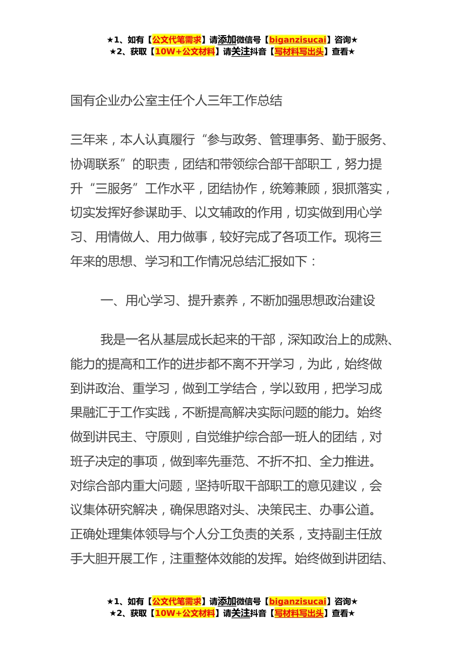★1、如有【公文代笔需求】请添加微信号【biganzisucai】咨询★★2、获取【10W+公文材料】请关注抖音【写材料写出头】查看★国有企业办公室主任个人三年工作总结三年来,本人认真履行“参与政务、管理事务、勤于服务、协调联系”的职责,团结和带领综合部干部职工,努力提升“三服务”工作水平,团结协作,统筹兼顾,狠抓落实,切实发挥好参谋助手、以文辅政的作用,切实做到用心学习、用情做人、用力做事,较好完成了各项工作。现将三年来的思想、学习和工作情况总结汇报如下:一、用心学习、提升素养,不断加强思想政治建设我是一名从基层成长起来的干部,深知政治上的成熟、能力的提高和工作的进步都不离不开学习,为此,始终做到讲政治、重学习,做到工学结合,学以致用,把学习成果融汇于工作实践,不断提高...