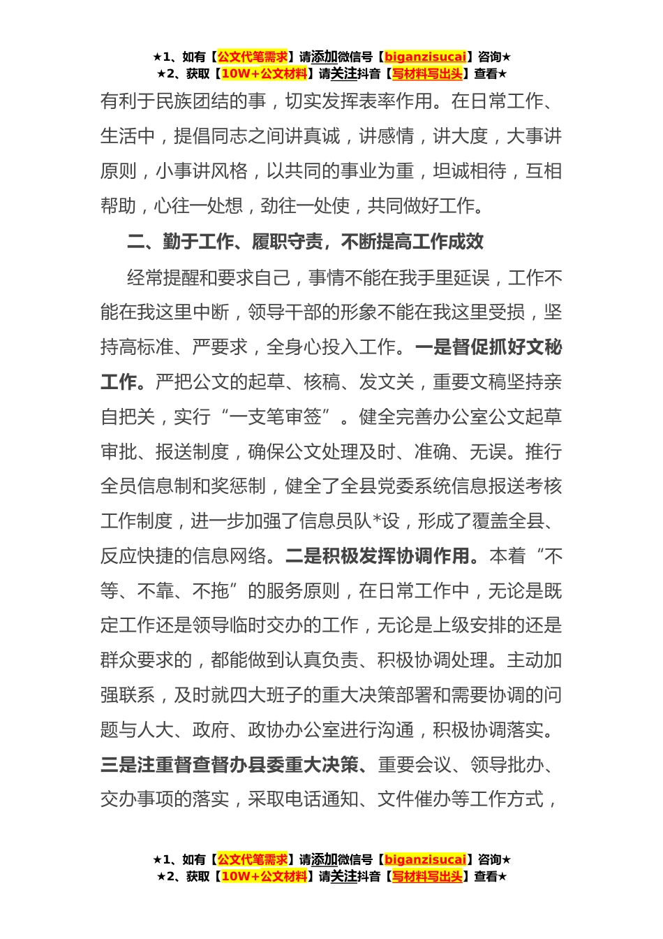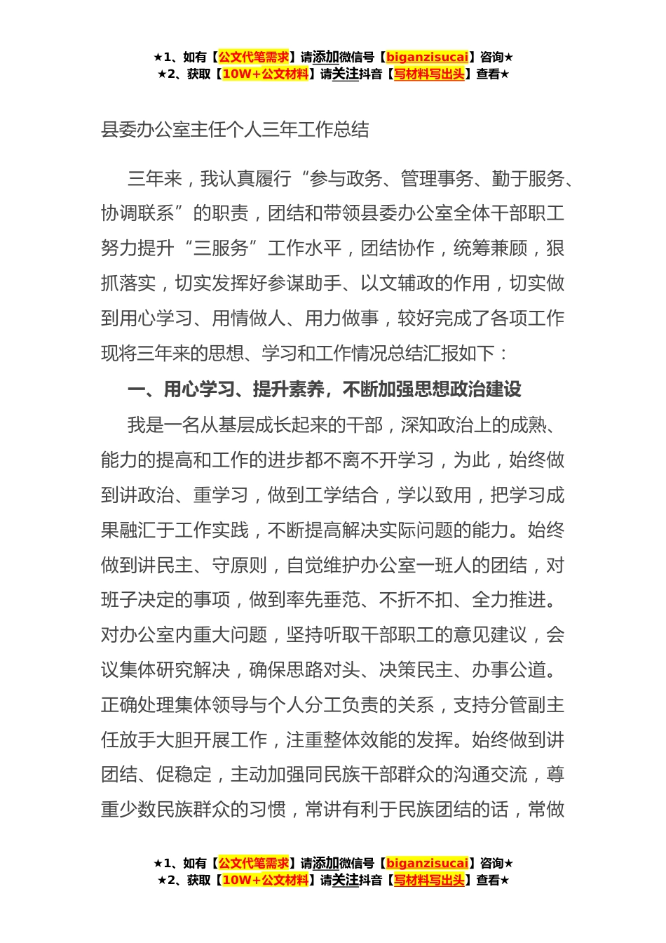 ★1、如有【公文代笔需求】请添加微信号【biganzisucai】咨询★★2、获取【10W+公文材料】请关注抖音【写材料写出头】查看★县委办公室主任个人三年工作总结三年来,我认真履行“参与政务、管理事务、勤于服务、协调联系”的职责,团结和带领县委办公室全体干部职工努力提升“三服务”工作水平,团结协作,统筹兼顾,狠抓落实,切实发挥好参谋助手、以文辅政的作用,切实做到用心学习、用情做人、用力做事,较好完成了各项工作现将三年来的思想、学习和工作情况总结汇报如下:一、用心学习、提升素养,不断加强思想政治建设我是一名从基层成长起来的干部,深知政治上的成熟、能力的提高和工作的进步都不离不开学习,为此,始终做到讲政治、重学习,做到工学结合,学以致用,把学习成果融汇于工作实践,不断提高解...