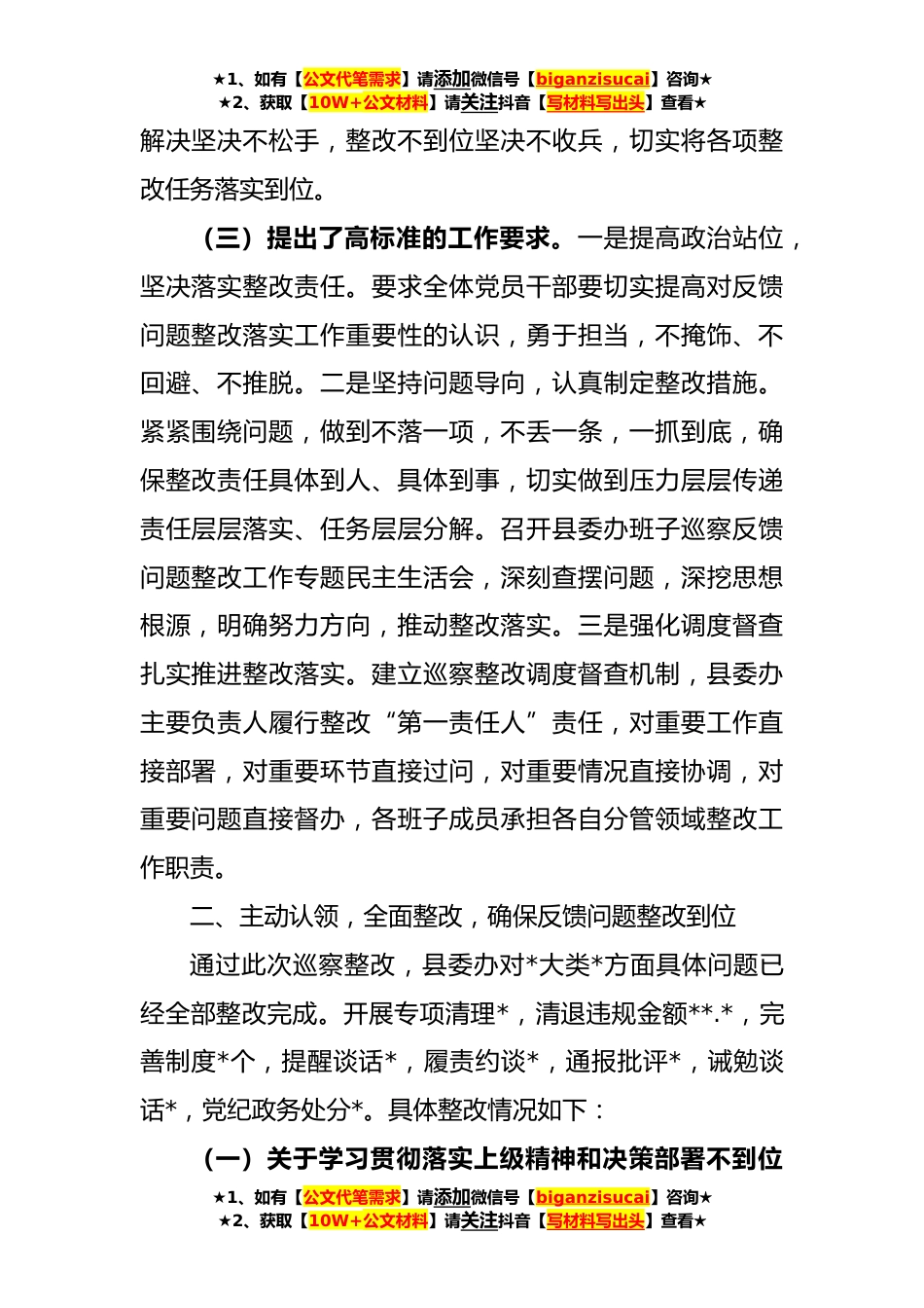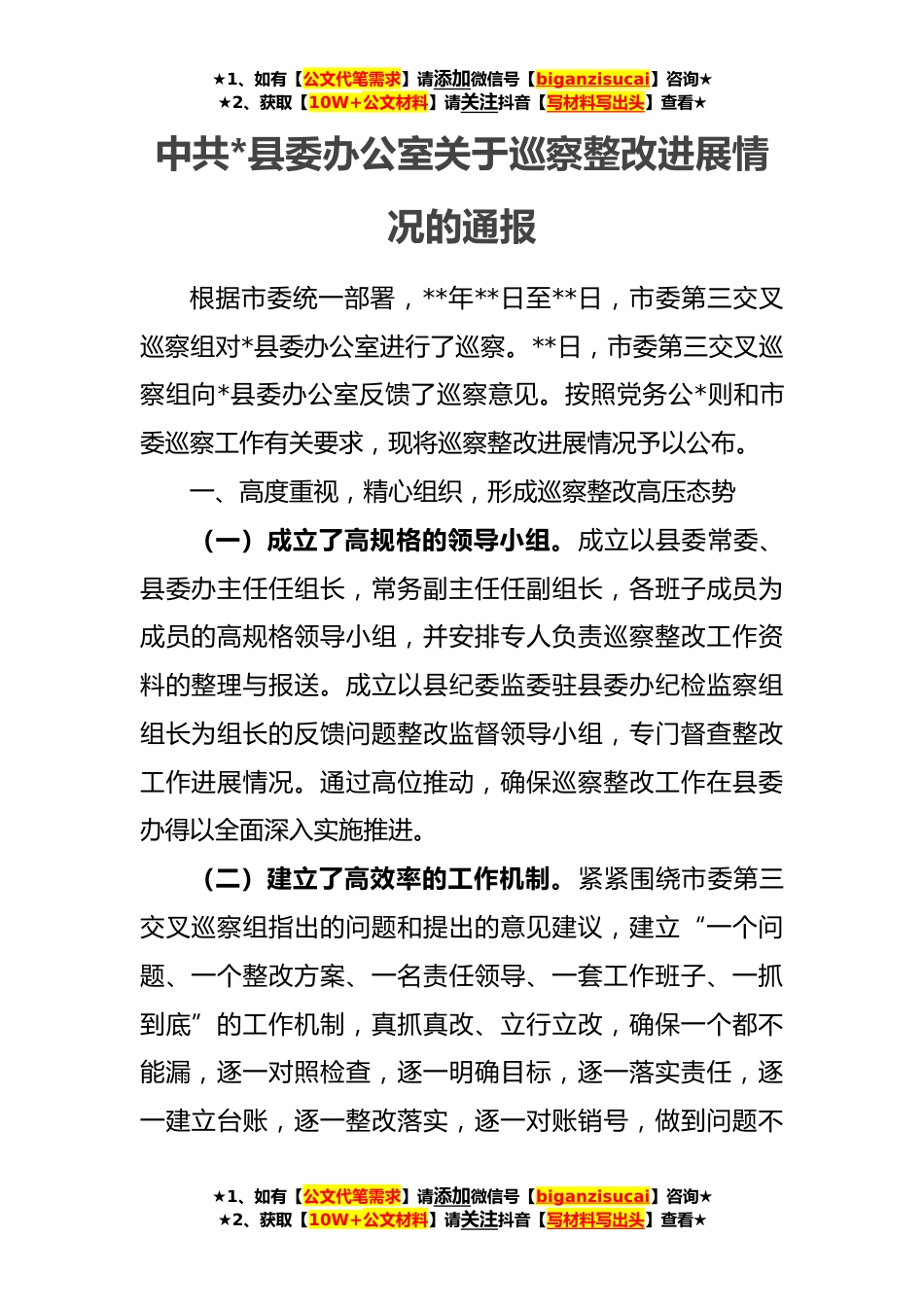 ★1、如有【公文代笔需求】请添加微信号【biganzisucai】咨询★★2、获取【10W+公文材料】请关注抖音【写材料写出头】查看★中共*县委办公室关于巡察整改进展情况的通报根据市委统一部署,**年**日至**日,市委第三交叉巡察组对*县委办公室进行了巡察。**日,市委第三交叉巡察组向*县委办公室反馈了巡察意见。按照党务公*则和市委巡察工作有关要求,现将巡察整改进展情况予以公布。一、高度重视,精心组织,形成巡察整改高压态势(一)成立了高规格的领导小组。成立以县委常委、县委办主任任组长,常务副主任任副组长,各班子成员为成员的高规格领导小组,并安排专人负责巡察整改工作资料的整理与报送。成立以县纪委监委驻县委办纪检监察组组长为组长的反馈问题整改监督领导小组,专门督查整改工作进展情况。通过...