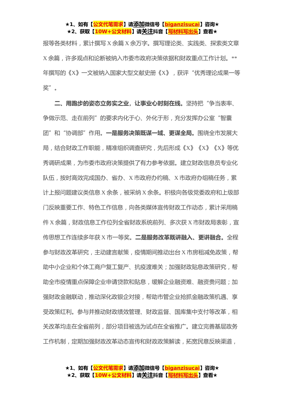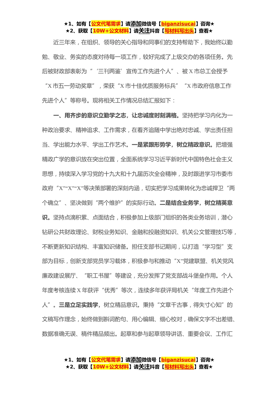 ★1、如有【公文代笔需求】请添加微信号【biganzisucai】咨询★★2、获取【10W+公文材料】请关注抖音【写材料写出头】查看★近三年来,在组织、领导的关心指导和同事们的支持帮助下,我始终以勤勉、敬业、务实的态度对待每一项工作,较好完成了上级交办的各项任务。先后被财政部表彰为“‘三刊两鉴’宣传工作先进个人”、被X市总工会授予“X市五一劳动奖章”,荣获“X市十佳优质服务标兵”“X市政府信息工作先进个人”等称号。现将相关工作情况总结汇报如下:一、用齐步的意识立勤学之志,让忠诚度时刻满格。坚持把学习内化为一种政治要求、精神追求、工作需求,在看齐追随中学出绝对忠诚、学出责任担当、学出能力水平、学出工作艺术。一是紧跟形势学,树立精政意识。把增强精政广学的意识放在突出位置,全面系统...