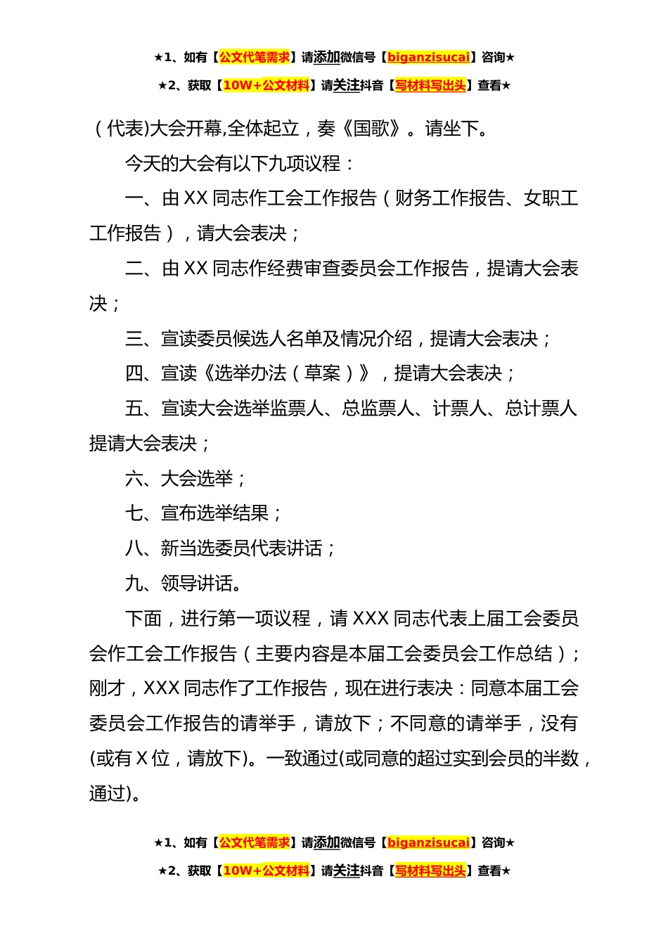 ★1、如有【公文代笔需求】请添加微信号【biganzisucai】咨询★★2、获取【10W+公文材料】请关注抖音【写材料写出头】查看★机关基层工会委员会换届民主选举大会主持词主持人XX:大会临近开始时,由工作人员清点到会的会员人数,决定是否可以开会,以下是主持人(一般为本届工会主席)根据选举程序要求,所讲的主持词:同志们:根据《中华人民*国工会法》和《中国工会章程》的有关规定和要求,本届工会委员会、工会经审委员会和女职工委员会已经届满,应当进行换届选举。今天,我们在这里召开XX市XXX(单位名称)工会第X次会员(会员代表)大会,主要议题就是要选举产生第X届XX市XXX(单位名称)工会委员会、工会经费审查委员会及女职工委员会。这次会议的召开,得到了局党组(党委)和上级工会的大力支持和帮助。今...
