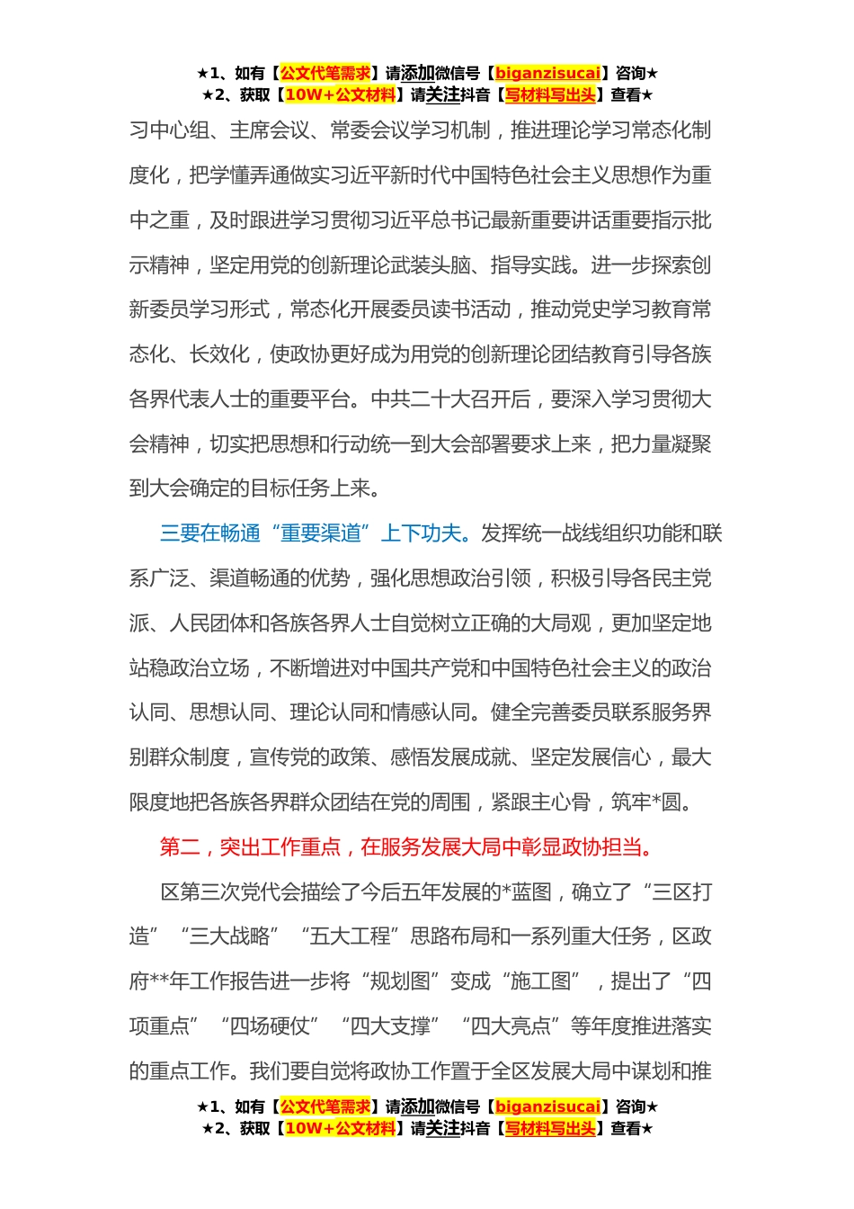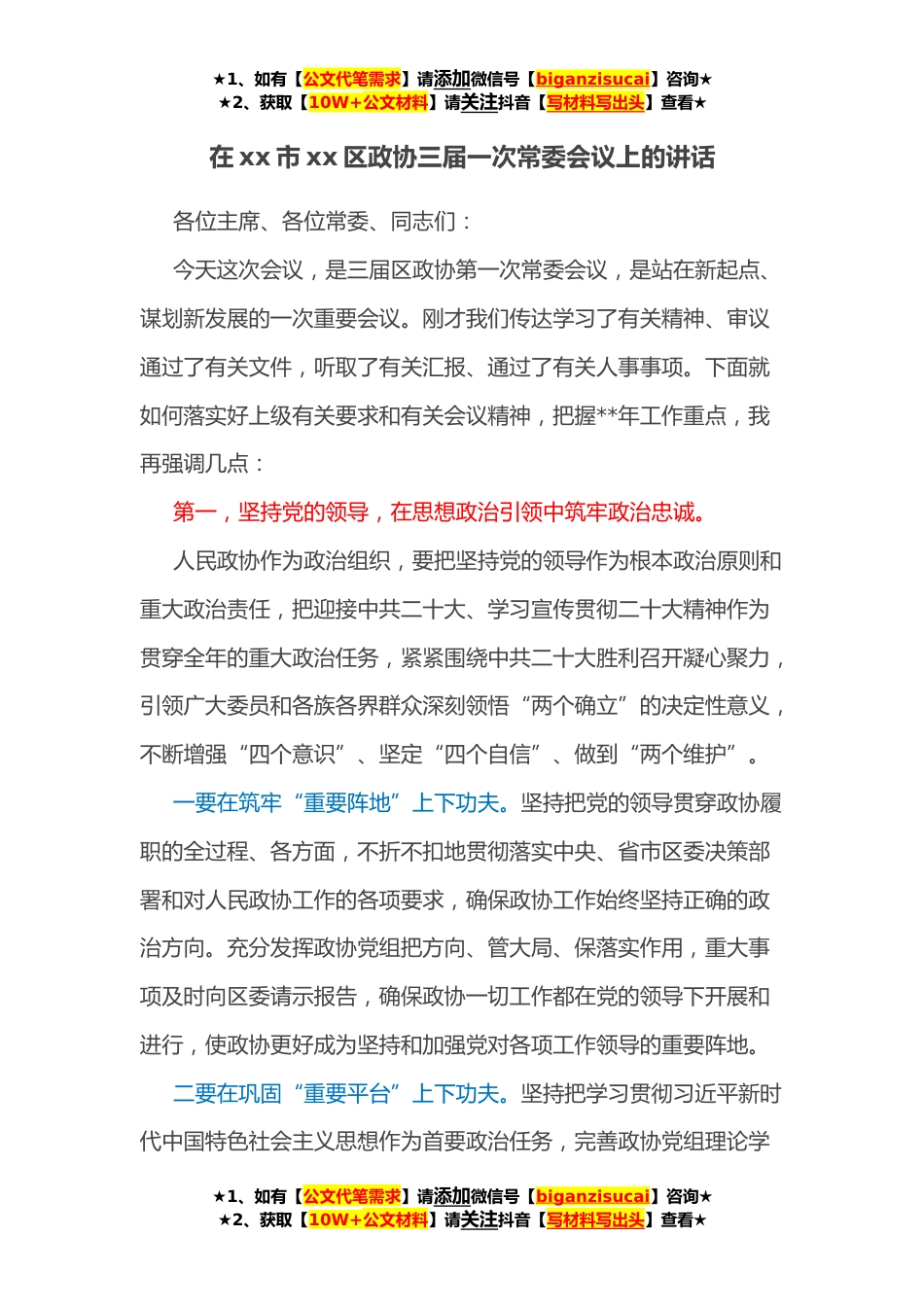 ★1、如有【公文代笔需求】请添加微信号【biganzisucai】咨询★★2、获取【10W+公文材料】请关注抖音【写材料写出头】查看★在xx市xx区政协三届一次常委会议上的讲话各位主席、各位常委、同志们:今天这次会议,是三届区政协第一次常委会议,是站在新起点、谋划新发展的一次重要会议。刚才我们传达学习了有关精神、审议通过了有关文件,听取了有关汇报、通过了有关人事事项。下面就如何落实好上级有关要求和有关会议精神,把握**年工作重点,我再强调几点:第一,坚持党的领导,在思想政治引领中筑牢政治忠诚。人民政协作为政治组织,要把坚持党的领导作为根本政治原则和重大政治责任,把迎接中共二十大、学习宣传贯彻二十大精神作为贯穿全年的重大政治任务,紧紧围绕中共二十大胜利召开凝心聚力,引领广大委员和...